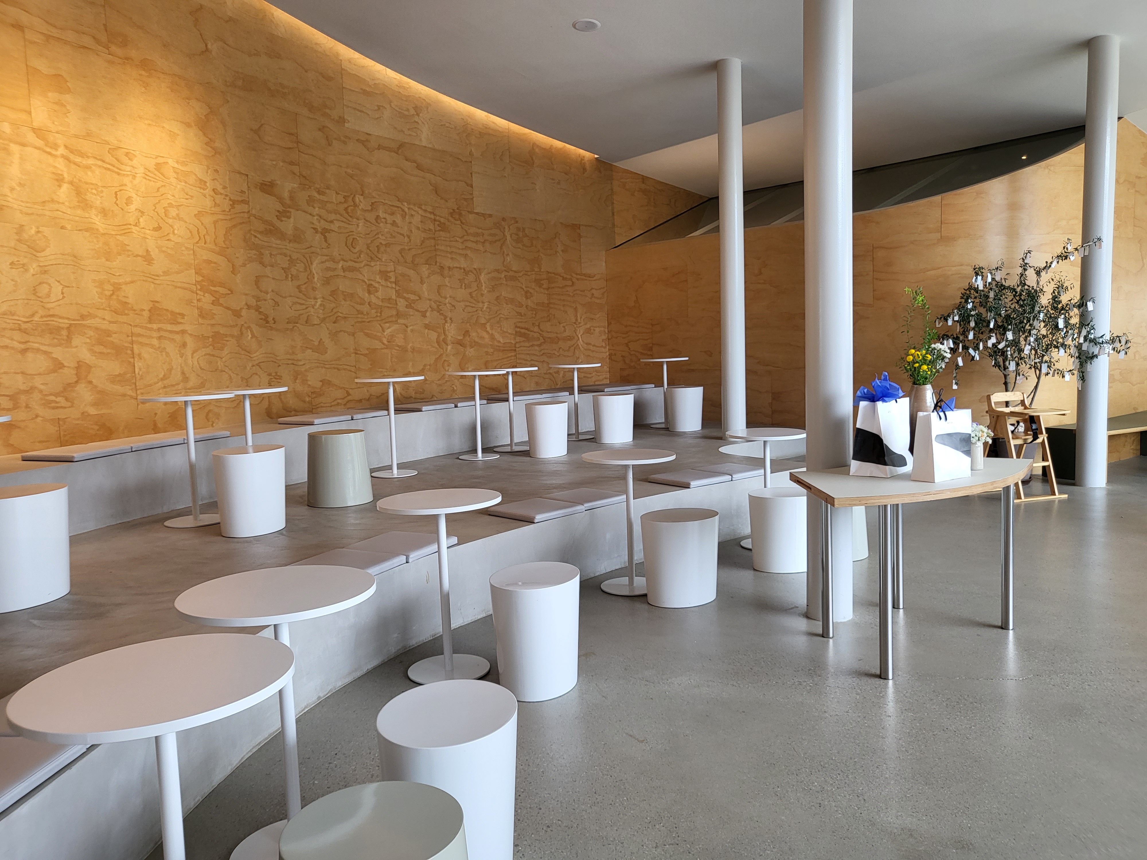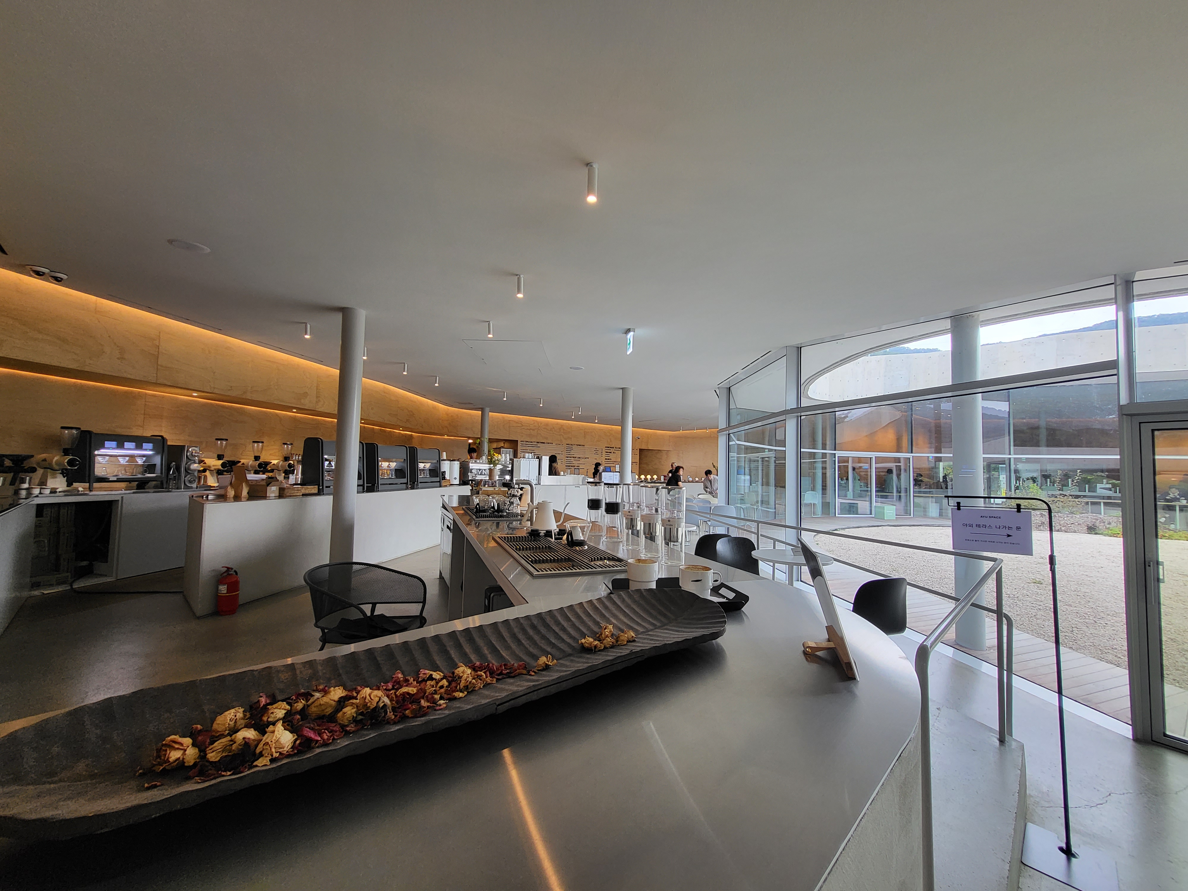 깔끔한 화이트 톤의 넓고 둥글게 이어진 실내 공간은 어느 자리에 앉아도 통유리를 통해 바깥 풍경을 감상할 수 있어요. 세계적인 건축가의 건축물이라니 뭐가 다르긴 다르네요.