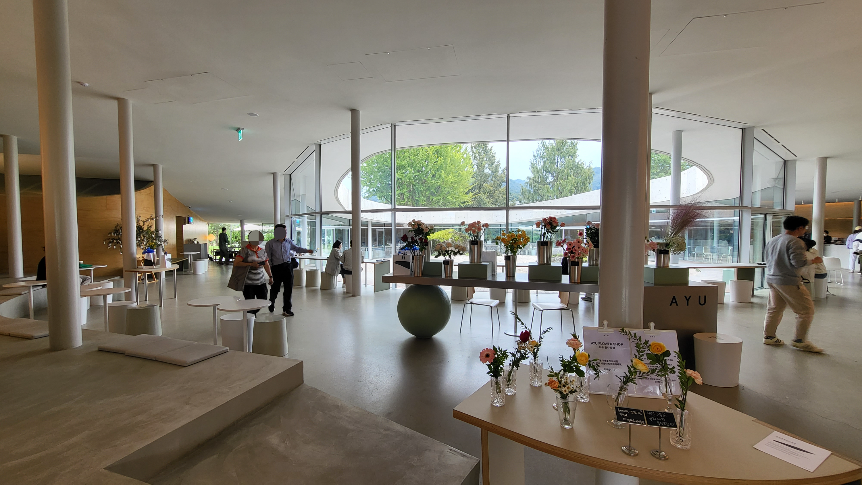 아유스페이스에 도착하니 입구부터 멋스럽게 생긴 500년 된 향나무가 맞이해 줍니다. 콘크리트 건물의 실내로 들어가니 타원 형태의 매우 넓은 공간이 중앙에 공간을 두고 특이한 구조로 되어 있네요.