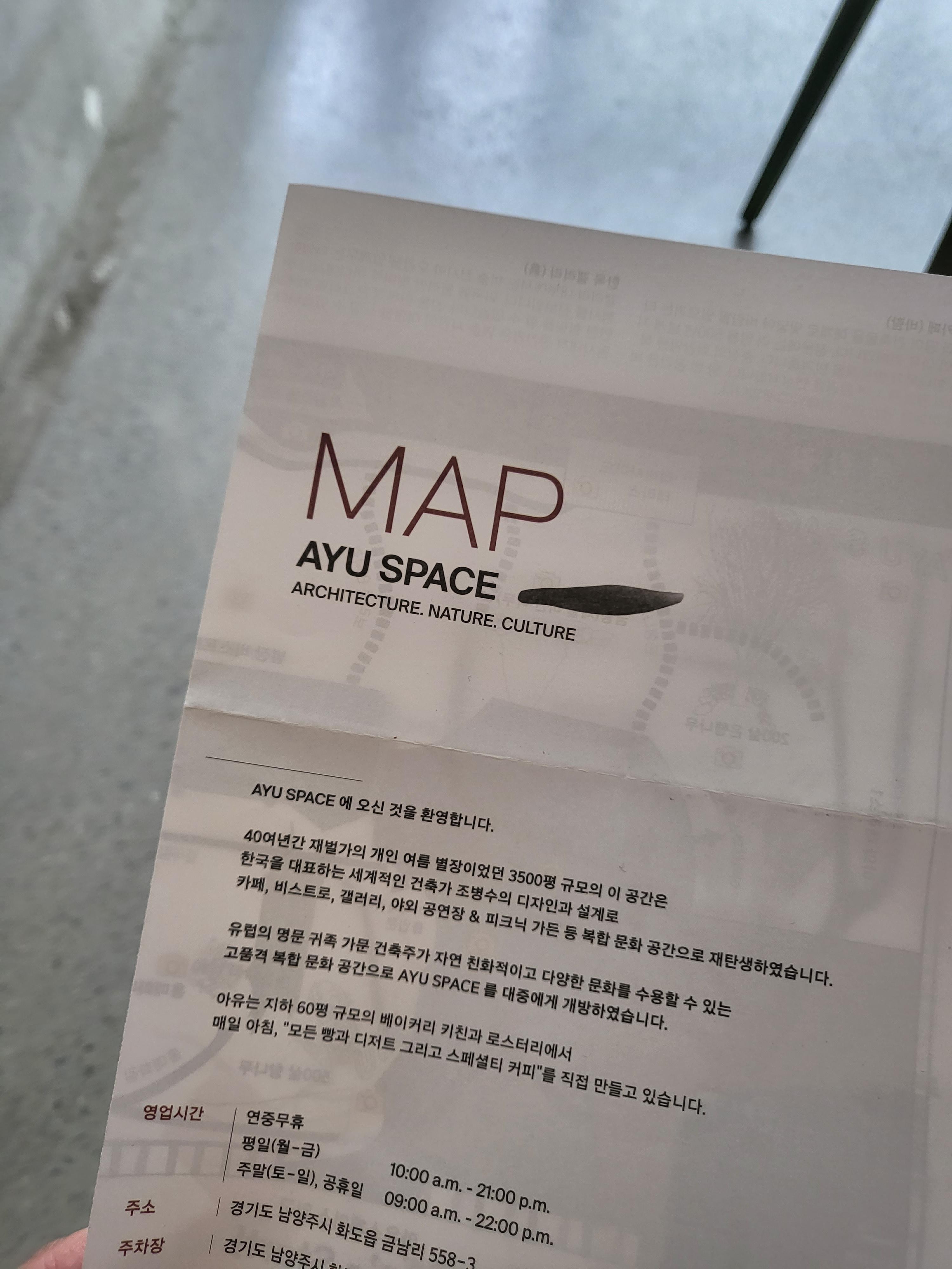 AYU SPACE는 이름처럼 아름다움이 있는 공간인 거 같아요. 좋은 사람들과 고급스러운 공간에서 산책길을 걸으며 커피를 즐길 수 있는 서울 인근의 가까운 힐링 공간으로 추천합니다.