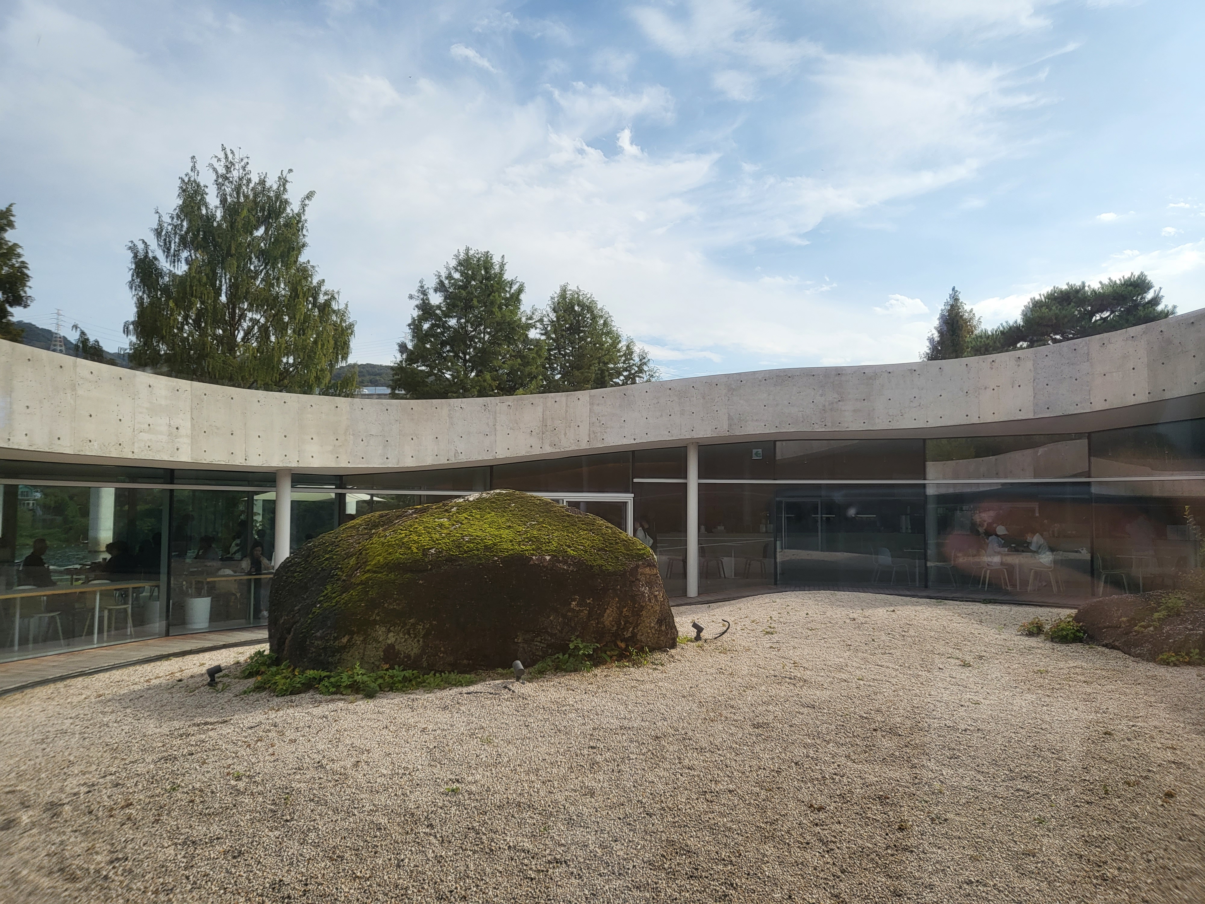 중앙에 뻥 뚫린 공간을 통해 자연채광이 들어오며 그 안에는 커다란 바위 몇개가 자리하고 있어요. 바위만 덩그러니 그 넓은 공간을 홀로 차지하고 있는데 바위가 이렇게 멋있게 느껴질 줄이야. 하나의 조각물 같고 공간과 자연스러운 조화를 이루네요.