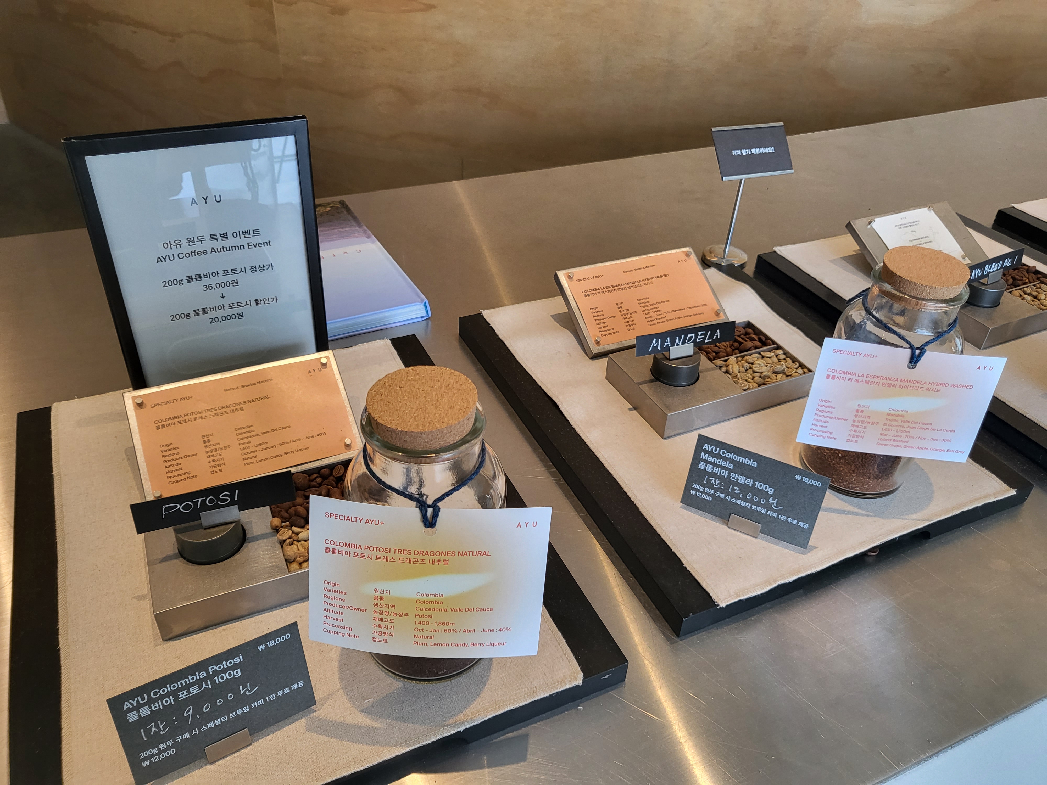 아유스페이스에서는 커피는 물론 드레싱, 오일, 잼, 버터 등 다양한 제품들을 판매하고 있어요. 포장까지 예쁘고 고급져서 선물용으로도 좋아보이네요.