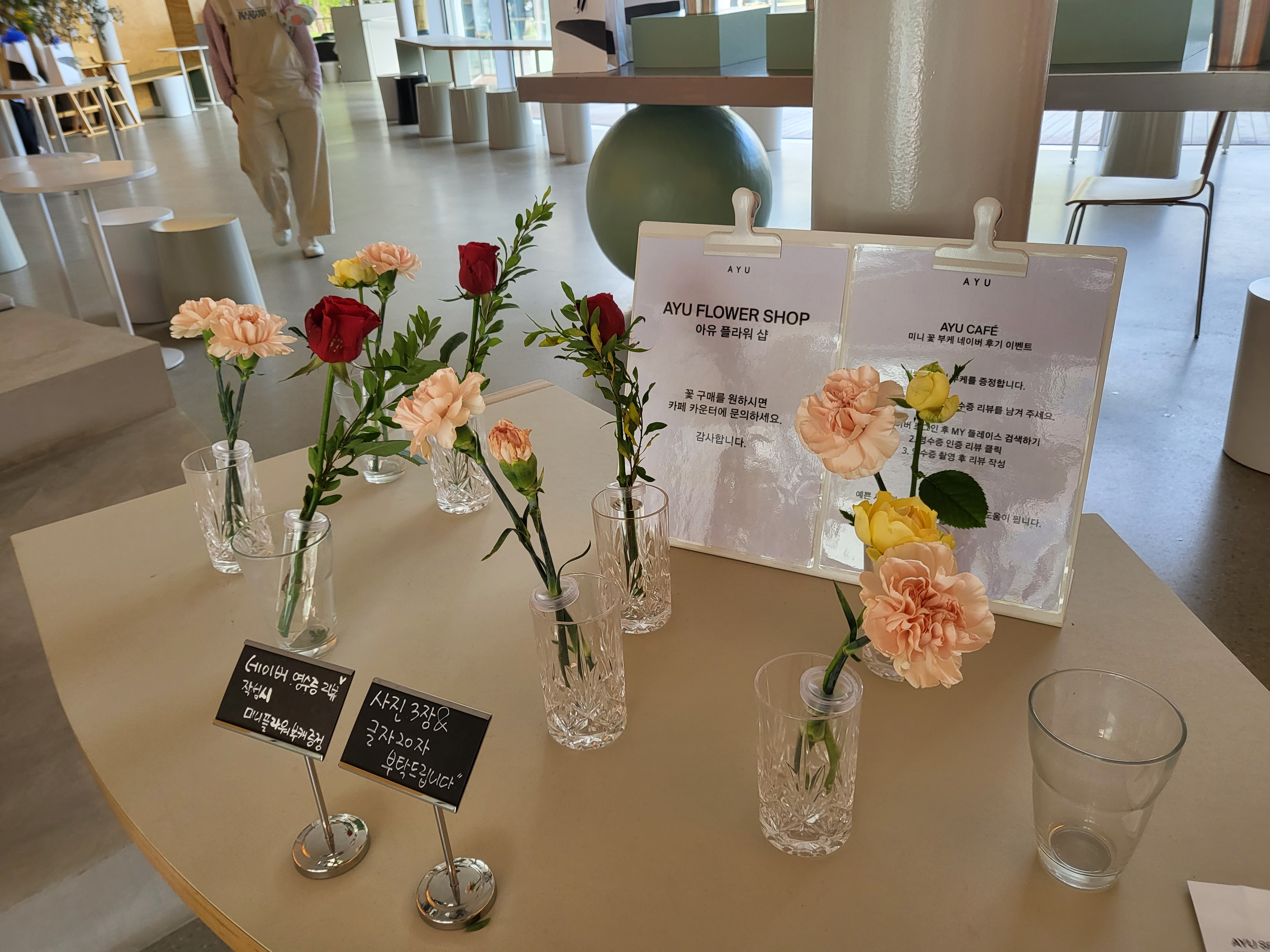 매장 한켠엔 AYU플라워샵이 있어서 다양한 꽃도 판매하고 있는데요 네이버 마이플레이스 영수증 후기를 작성하면 손에 작게 쥐어주는 미니 부케를 무료로 받을 수 있습니다.