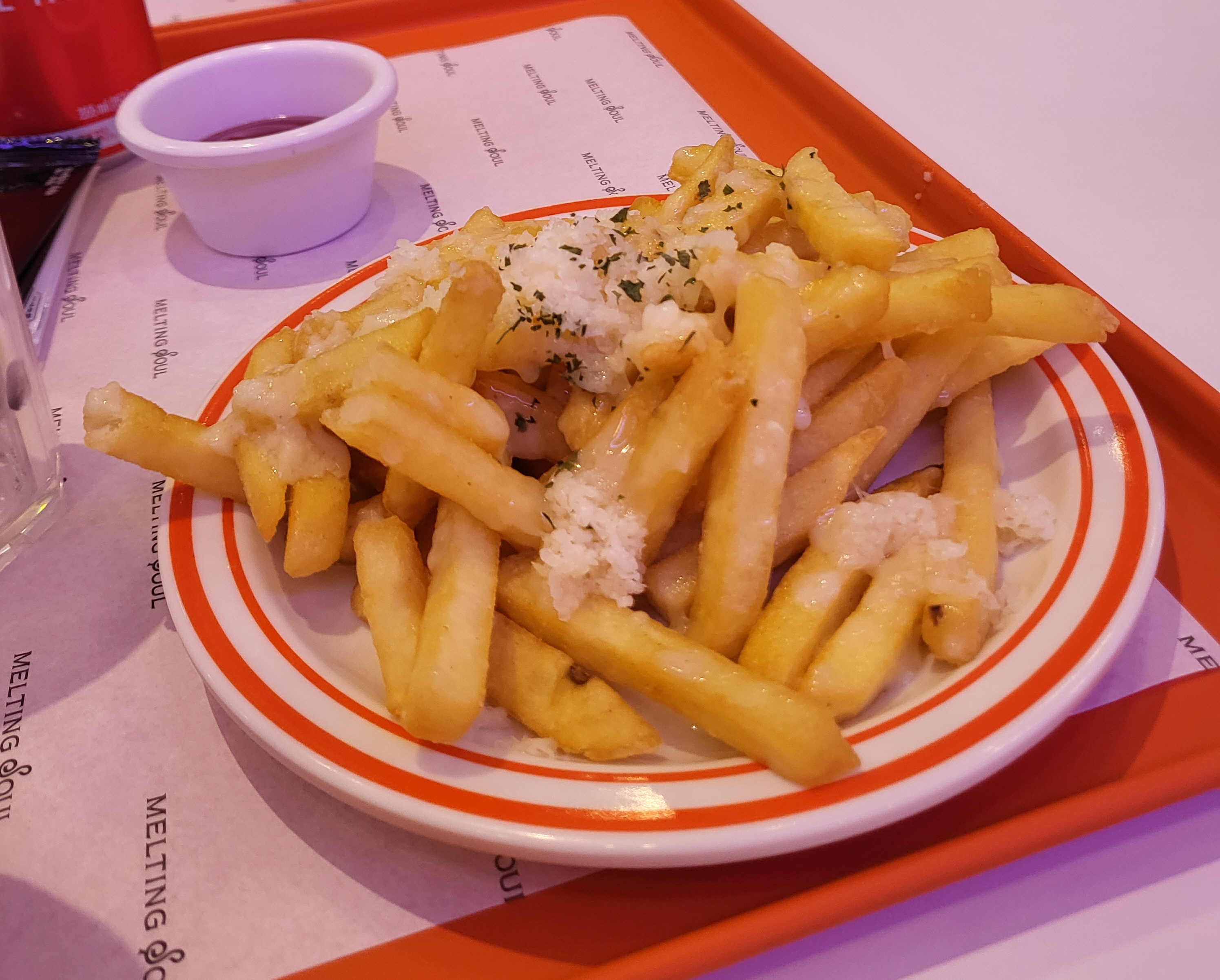 멜팅화이트라구 버거와 싱글버거, 갈릭프라이즈를 주문했습니다. 멜팅화이트라구 버거는 번 위에 화이트라구소스를 부어 먹는 시그니처 메뉴에요. 빵 위에 컵이 올려져 있고 그 위에 꾸덕한 치즈가 가득 얹어져 있는 특이한 모습이에요. 치즈가 쏟아지는 모습은 아래 영상을 보시면 됩니다 ^^