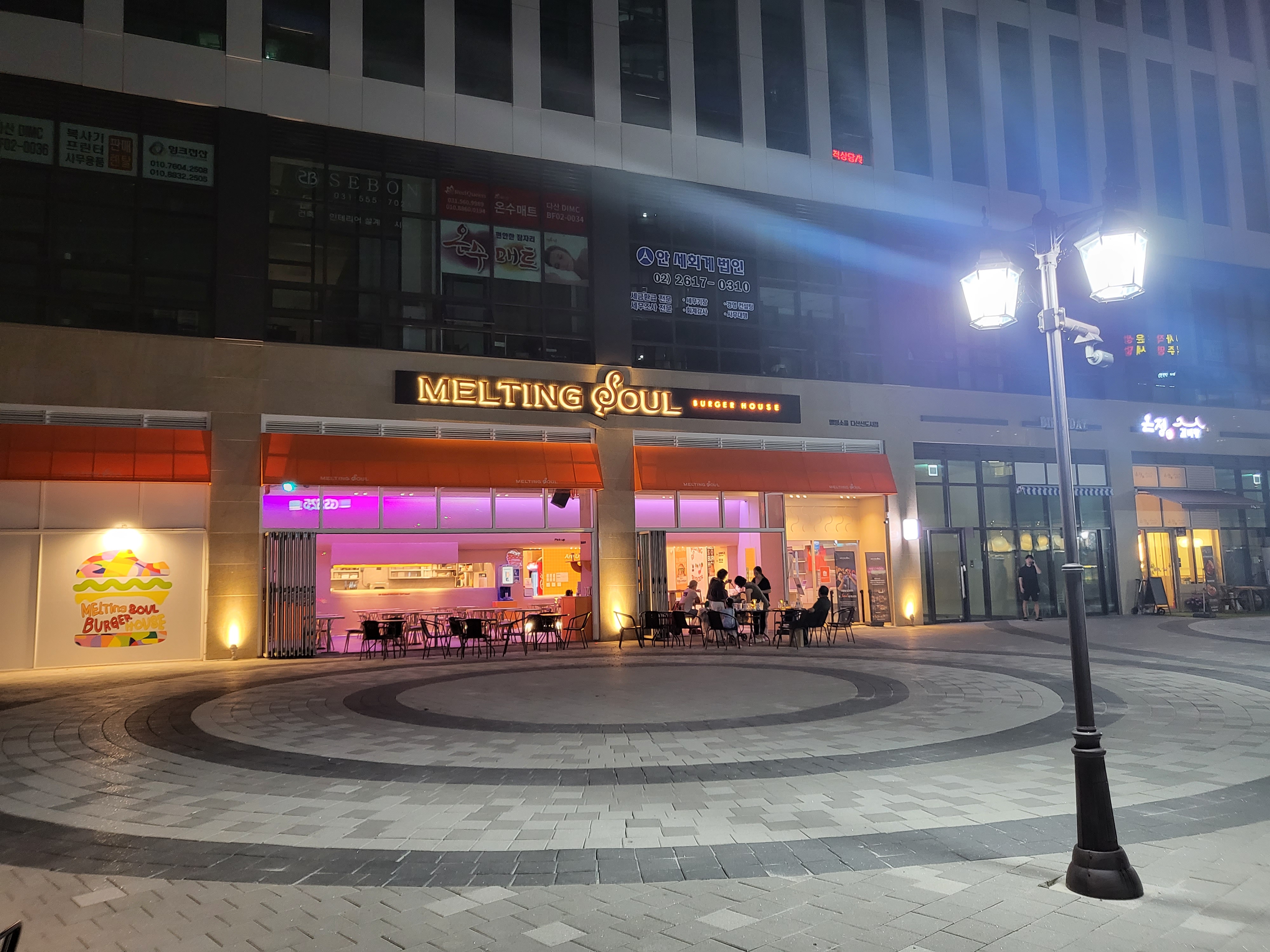 날이 저물어가니 핑크빛 조명으로 더욱 음악과 좋은 음식을 즐기기 좋은 분위기가 되었어요. 공간을 오픈하여 광장에 노래가 울려퍼지니 지나다니는 사람들도 서서 구경하고 가는 등 멜팅소울버거는 다산신도시의 명소가 되었네요.
