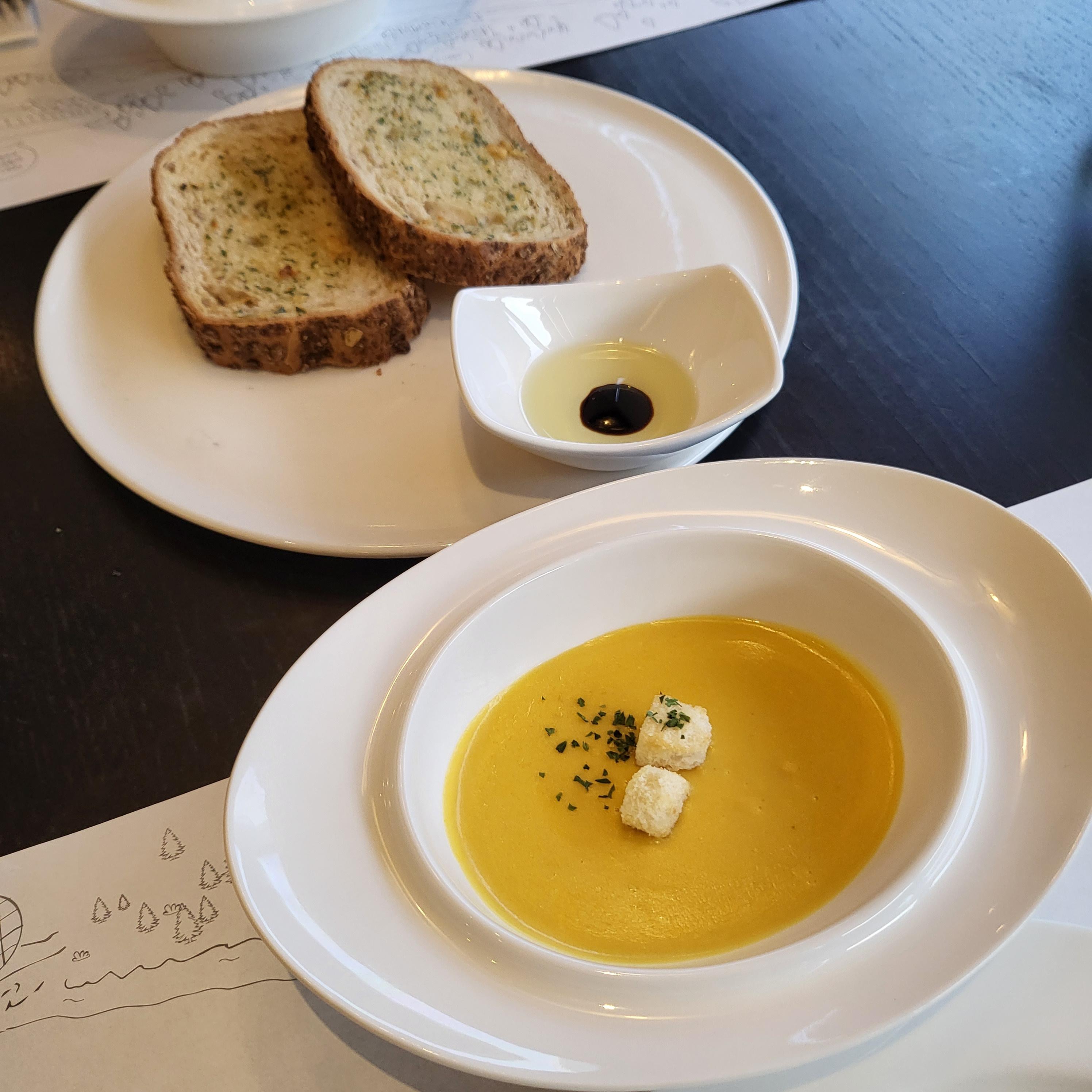 먼저 식전빵과 스프가 나왔습니다. 고소하고 바한 식전빵과 따끈하고 부드러운 스프의 조화로 시작합니다.
