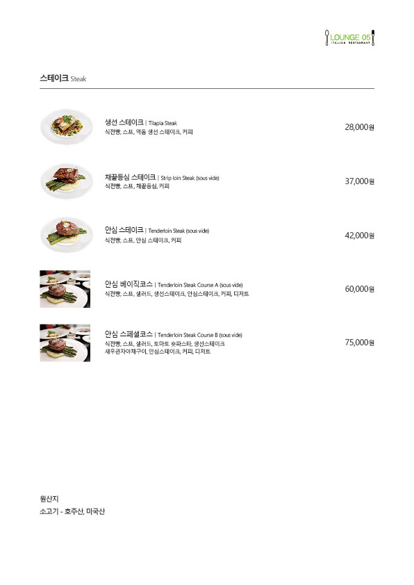 식전빵, 스프, 샐러드, 생선스테이크, 안심스테이크, 커피가 포함된 안심베이직(60,000원) 코스 요리와 파스타를 주문했어요.