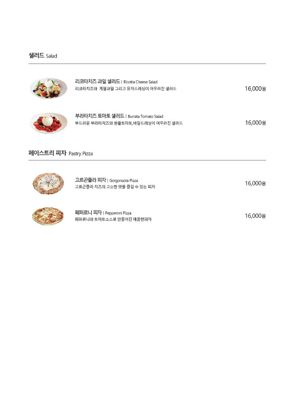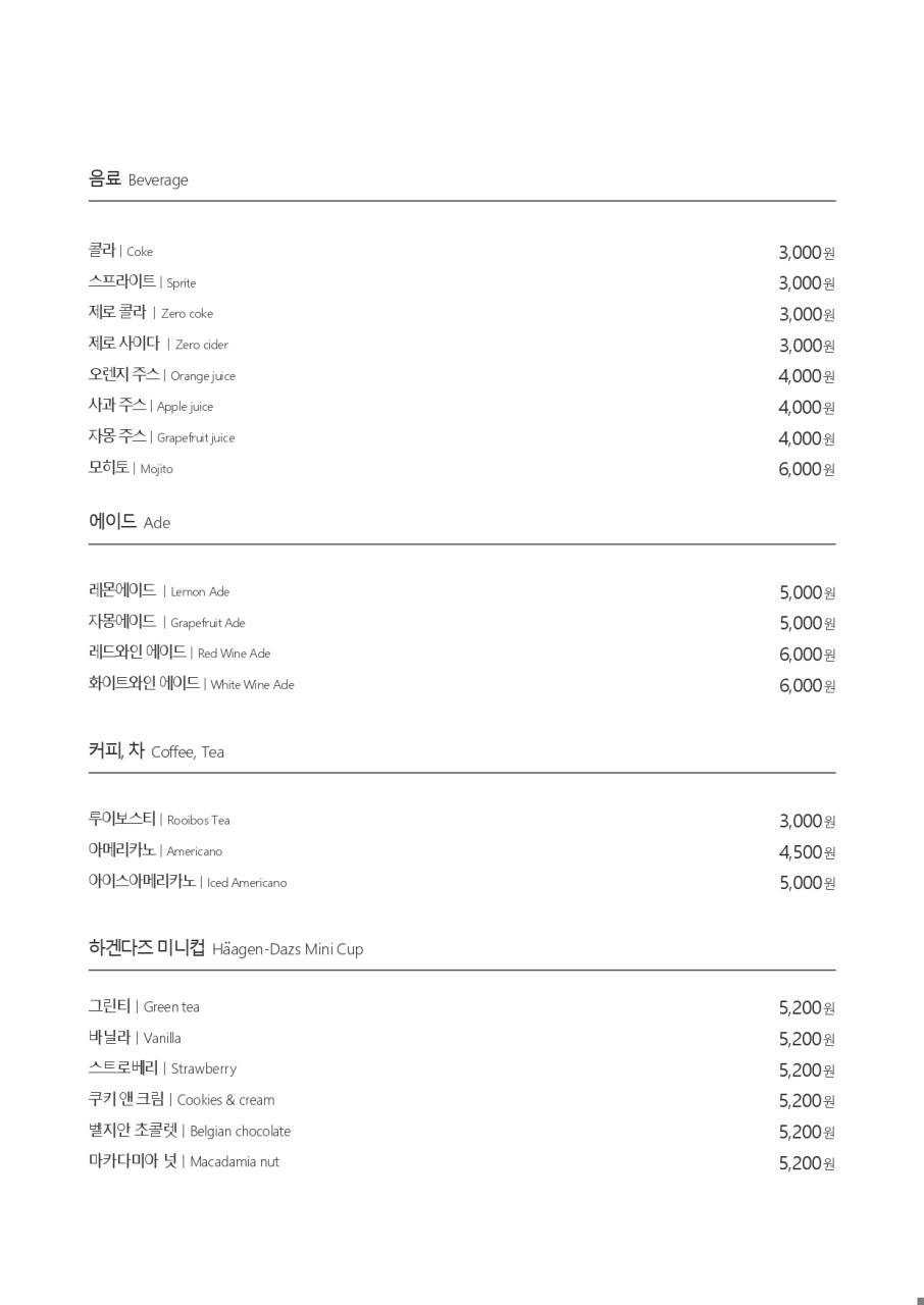메뉴는 각종 피자, 파스타, 스테이크, 샐러드 등 다양하게 있어요. 가격대는 레스토랑 분위기에 비해 그렇게 높지 않은 가격이었어요.