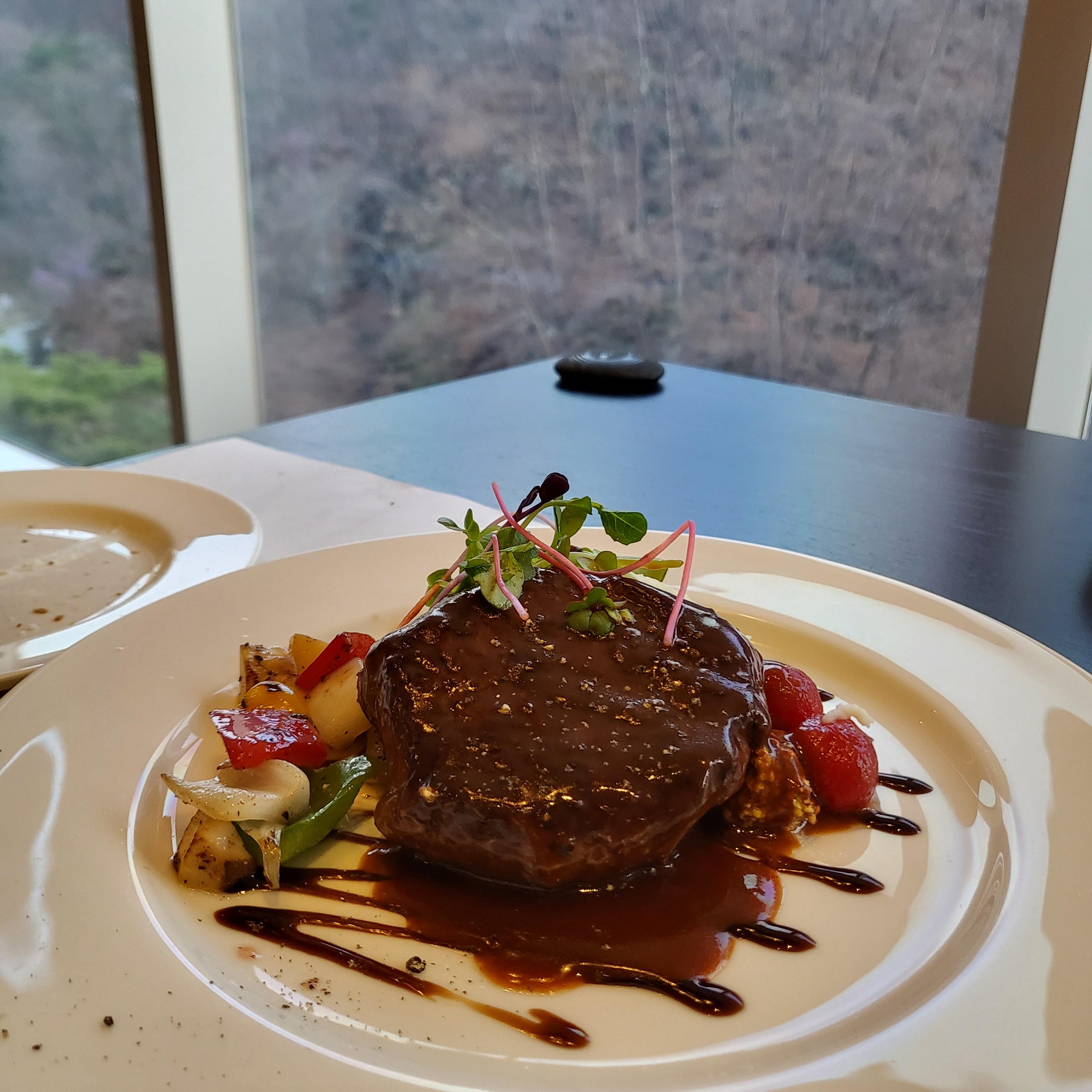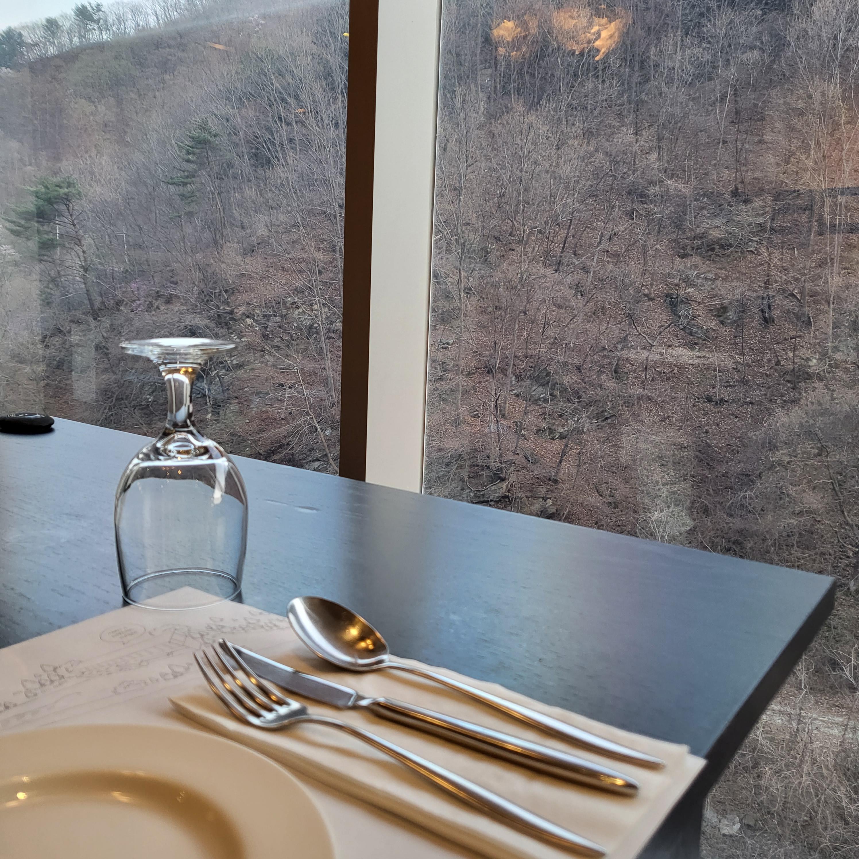 창가 쪽으로 여러 테이블들이 놓여져 있고 미술관 레스토랑답게 실내 조명과 인테리어에도 신경을 많이 쓴 거 같아 분위기는 좋은 거 같아요. 특히 창가 테이블에 앉아 창문 밖으로 산뷰와 계곡뷰를 보며 식사를 즐길 수 있어요. 단풍이나 푸릇푸릇 녹음이 짙은 계절에 오면 더 예쁠거 같다는 생각입니다 :)