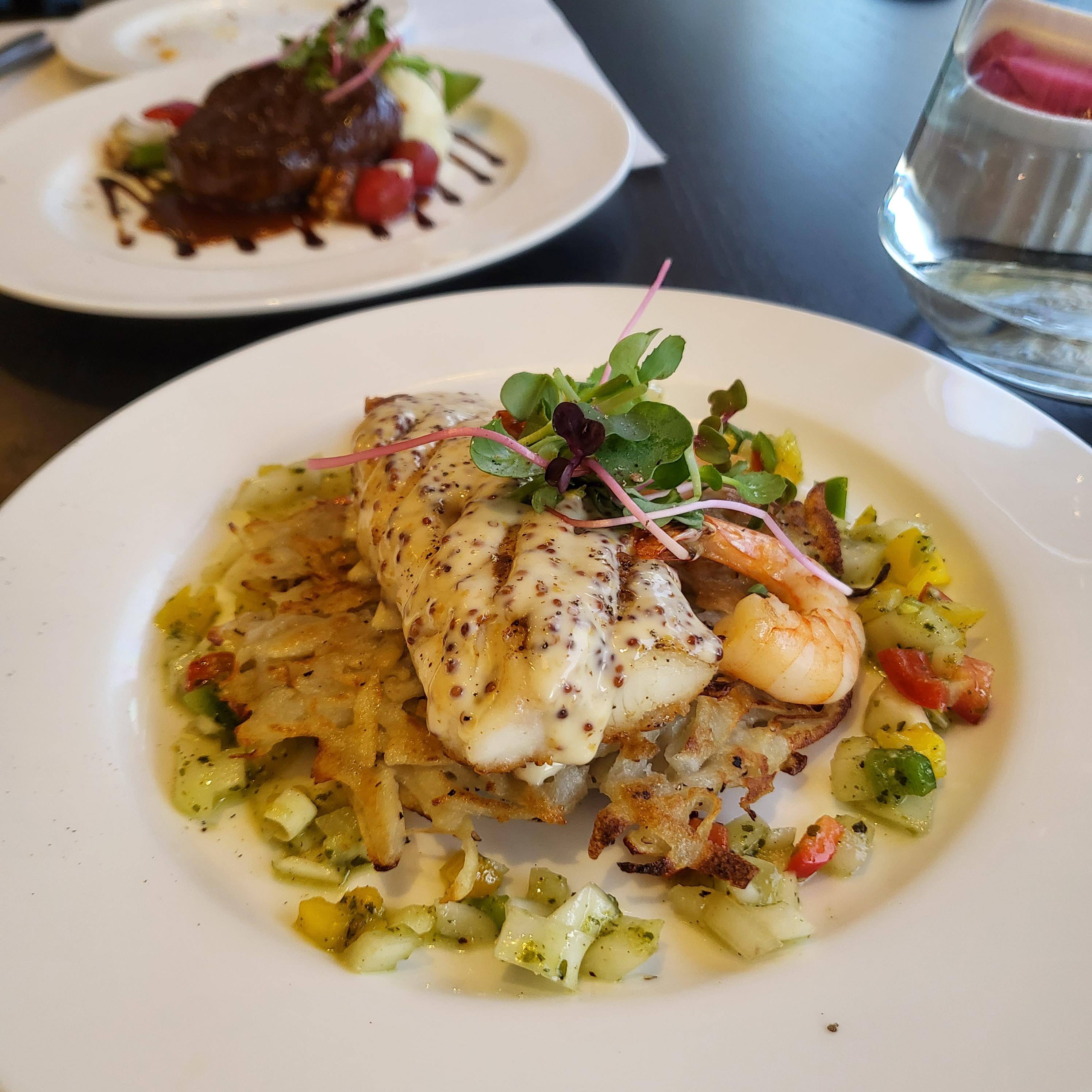 다음은 오늘의 메인메뉴 안심스테이크와 생선스테이크가 나왔어요. 양도 적당하고 예쁘고 정성스럽게 플레팅되어 나옵니다.