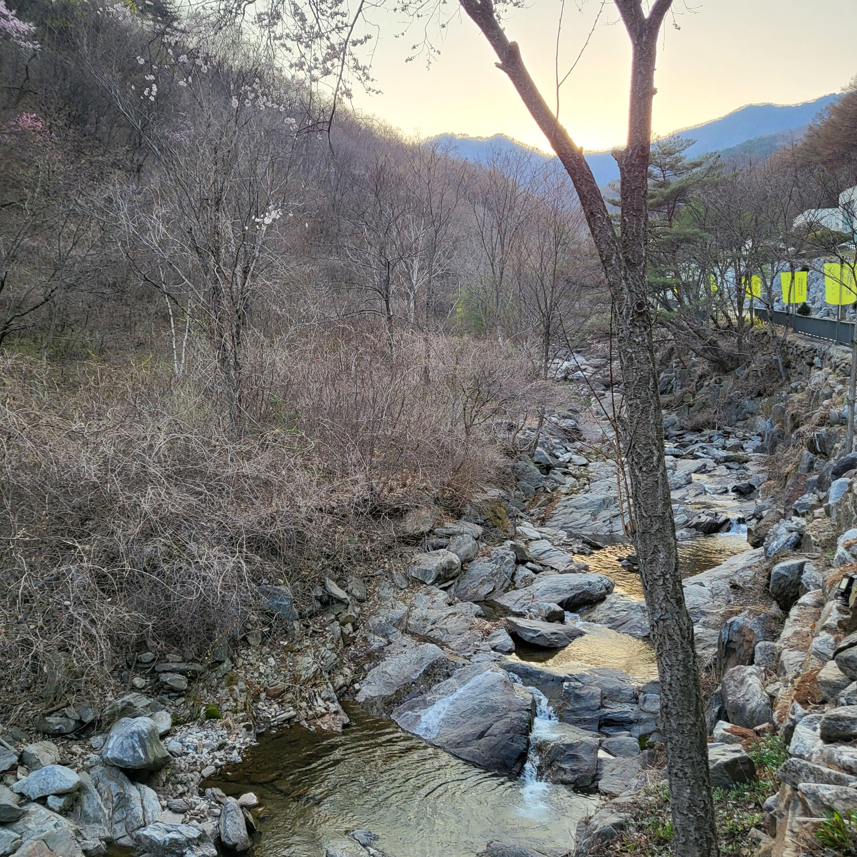 뒤로는 숲, 그리고 앞에는 계곡에 맑고 투명한 물이 흐르고 있어요.