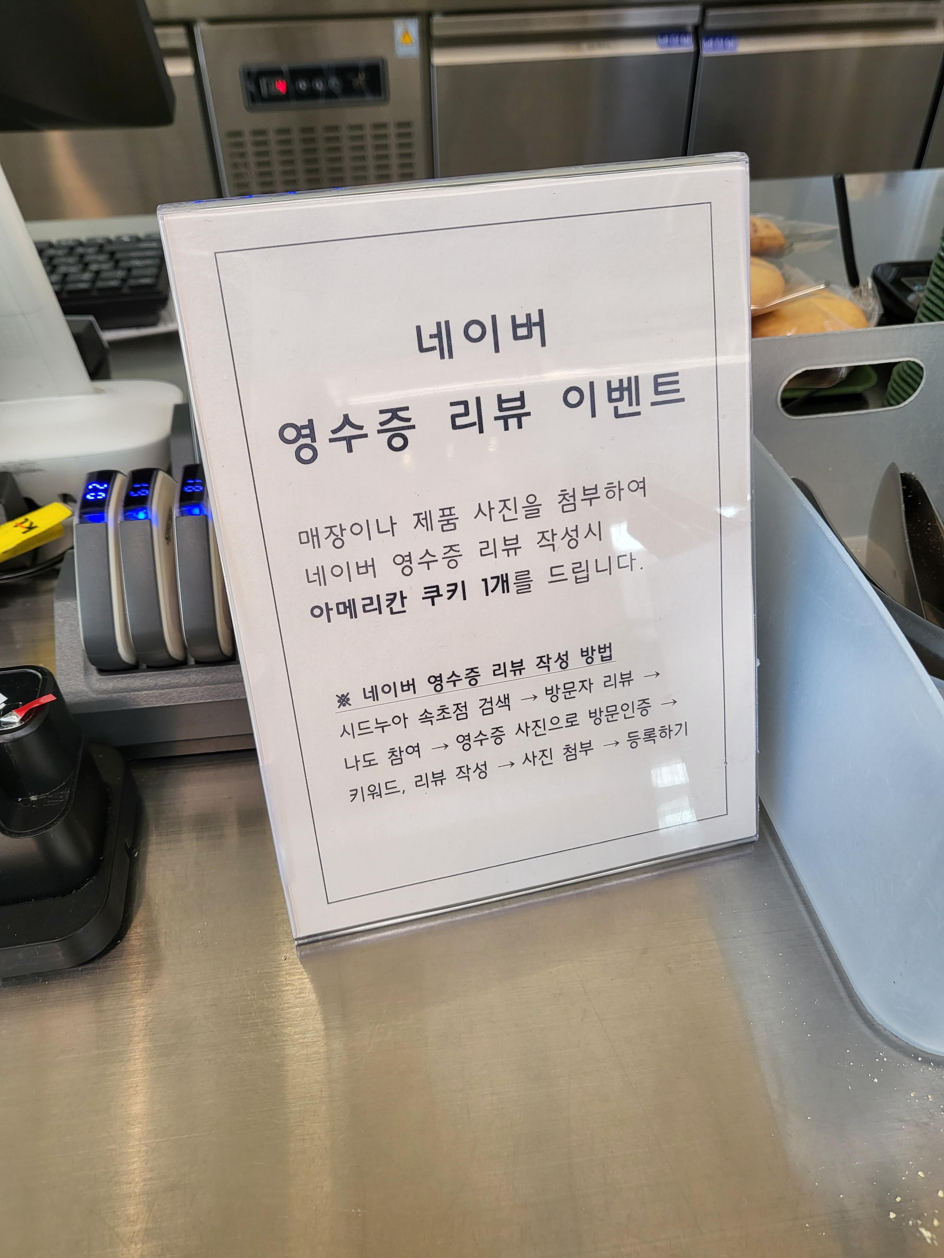 커피와 음료 종류는 심플해요. 그렇지만 있을 건 다 있는 거 같습니다 :) 네이버 영수증 리뷰 이벤트도 진행하고 있어요. 리뷰 작성 시 아메리칸 쿠키 1개를 서비스로 주네요.