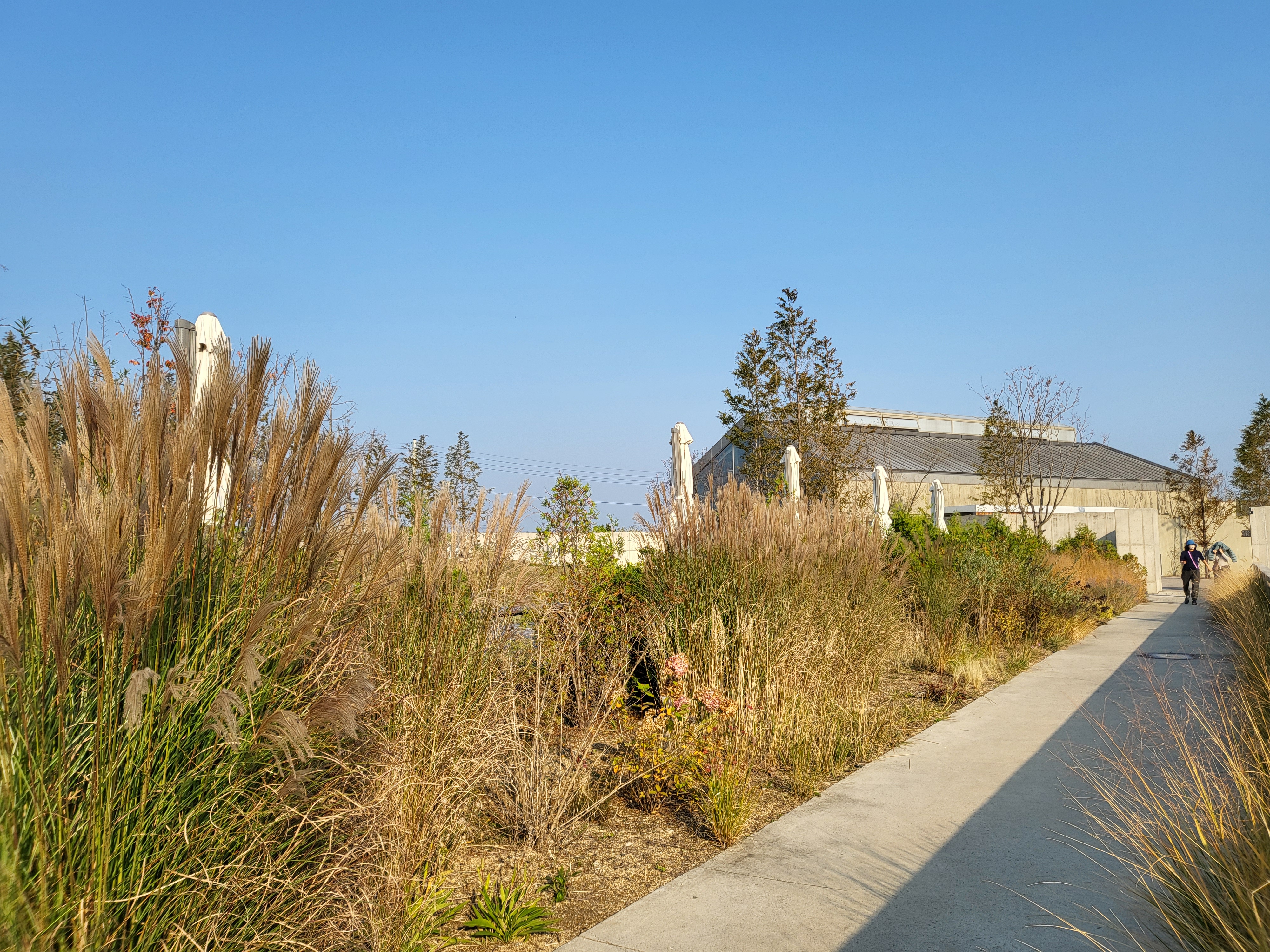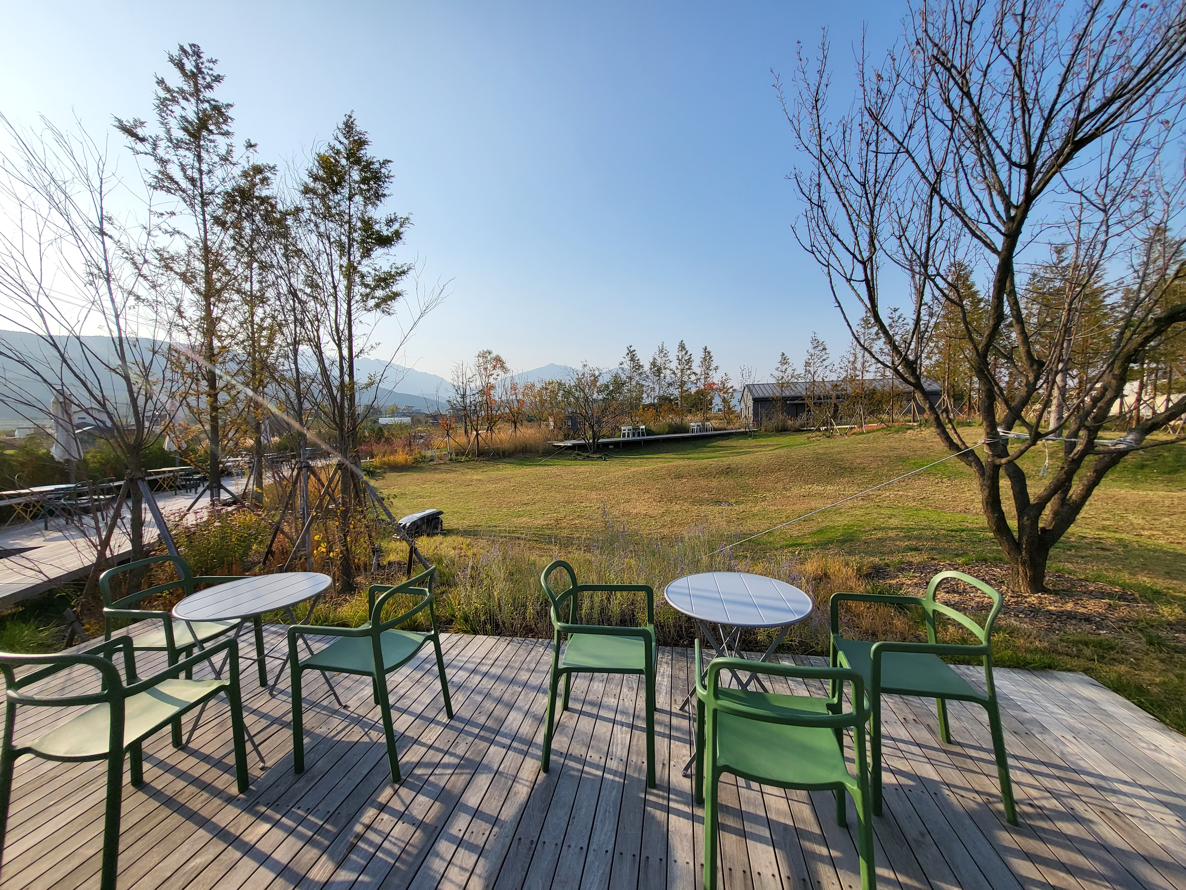 야외 정원으로 나왔어요. 가운데 넓은 잔디밭을 두고 주위에 데크가 되어 있고 여러 테이블들이 빙 둘러 있어요. 한적하고 여유로운 공간입니다.
