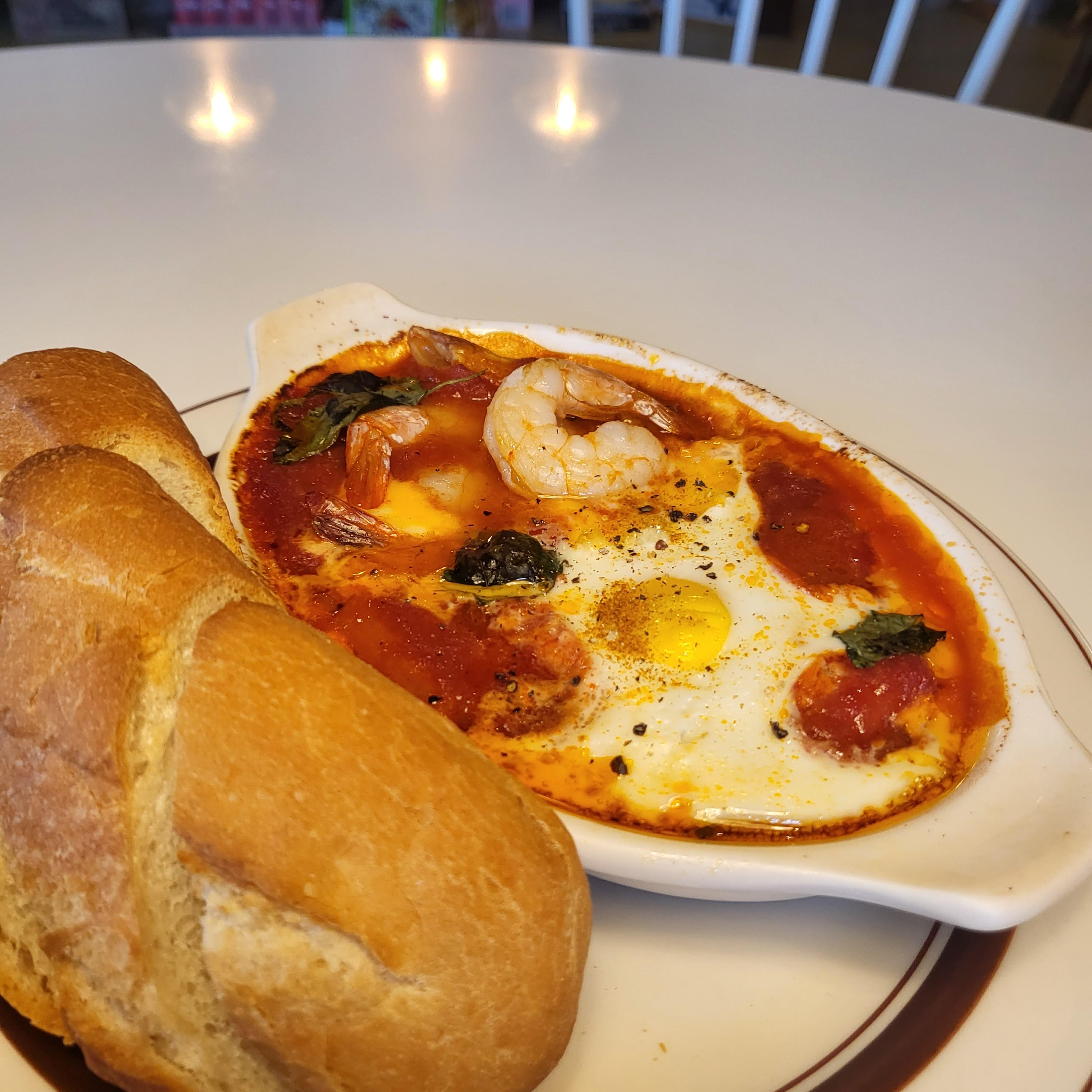 에그인헬은 잘 구워진 빵과 함께 토마토 스튜와 새우 그리고 계란이 알맞게 조리되어 나왔어요.