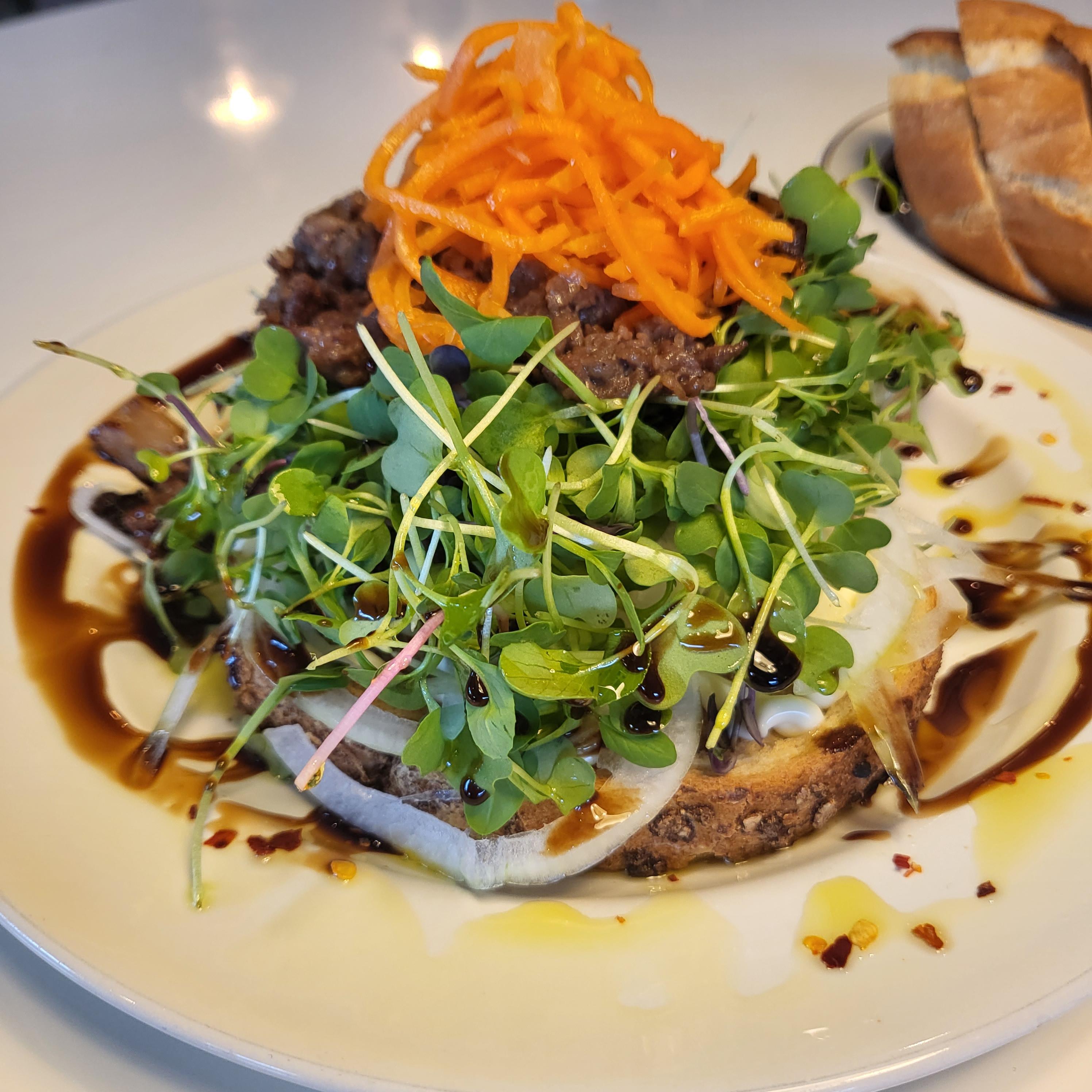 그리고 소고기, 버섯, 양파, 어른잎채소가 가득 담긴 오픈 샌드위치로 나온 불고기 타르틴