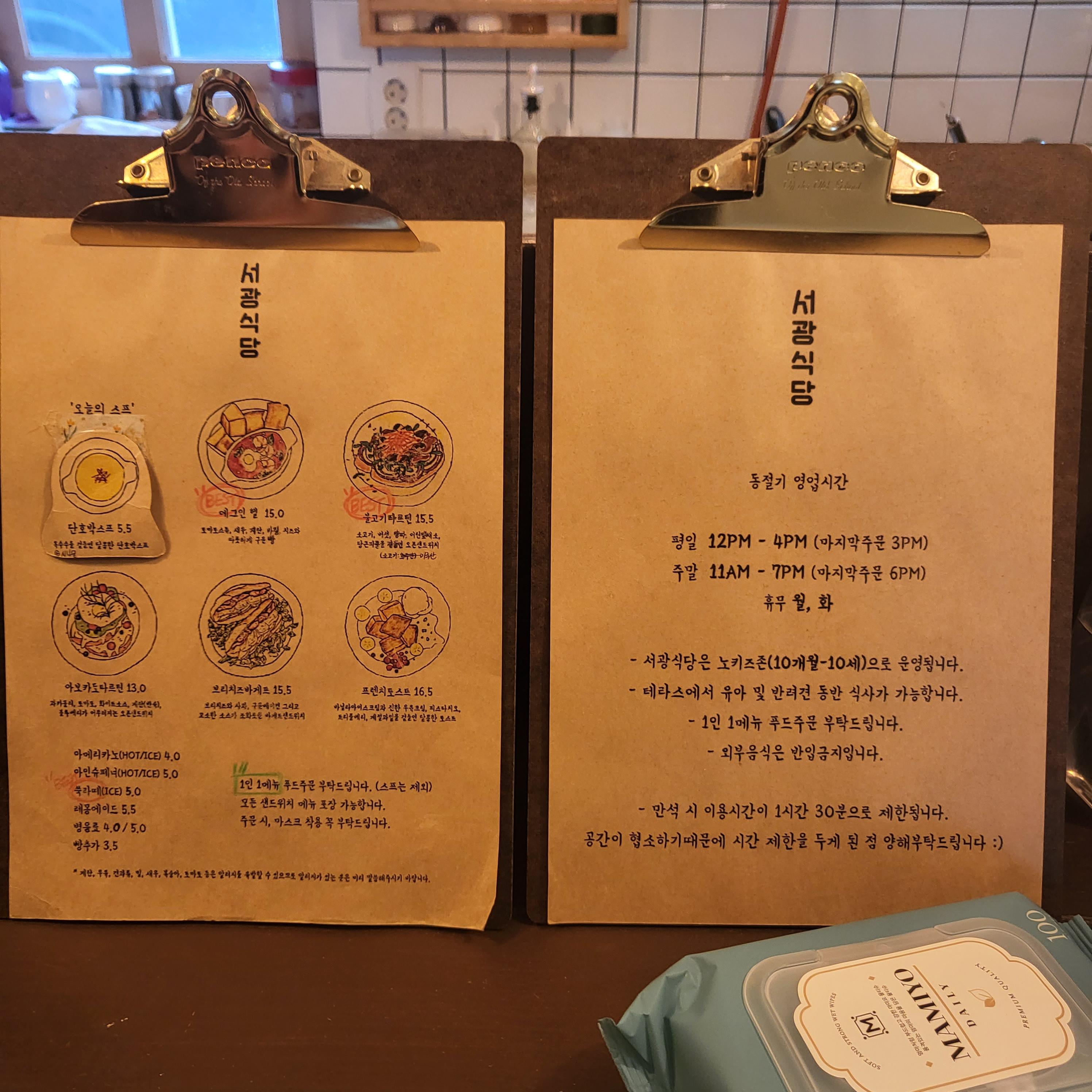 직접 손으로 만화처럼 그린듯 메뉴판도 특별해 보여요. 서광식당은 노키즈존이었다가 지금은 캐어키즈존에 야외에서는 애견동반도 가능하다고 하네요.