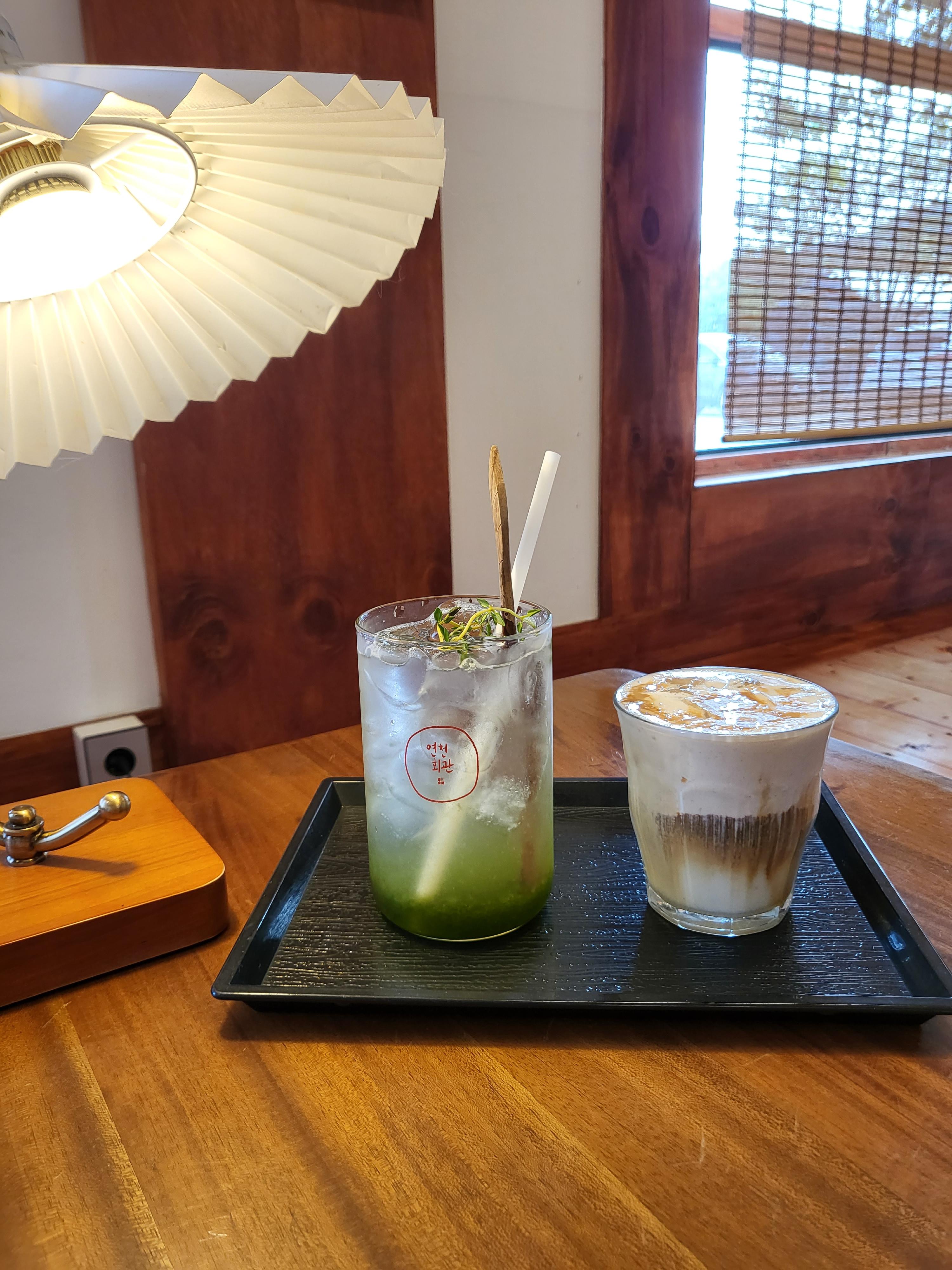 주문한 상큼한 청포도청심이와 율무와 에스프레소의 만남 연천커피가 나왔어요.