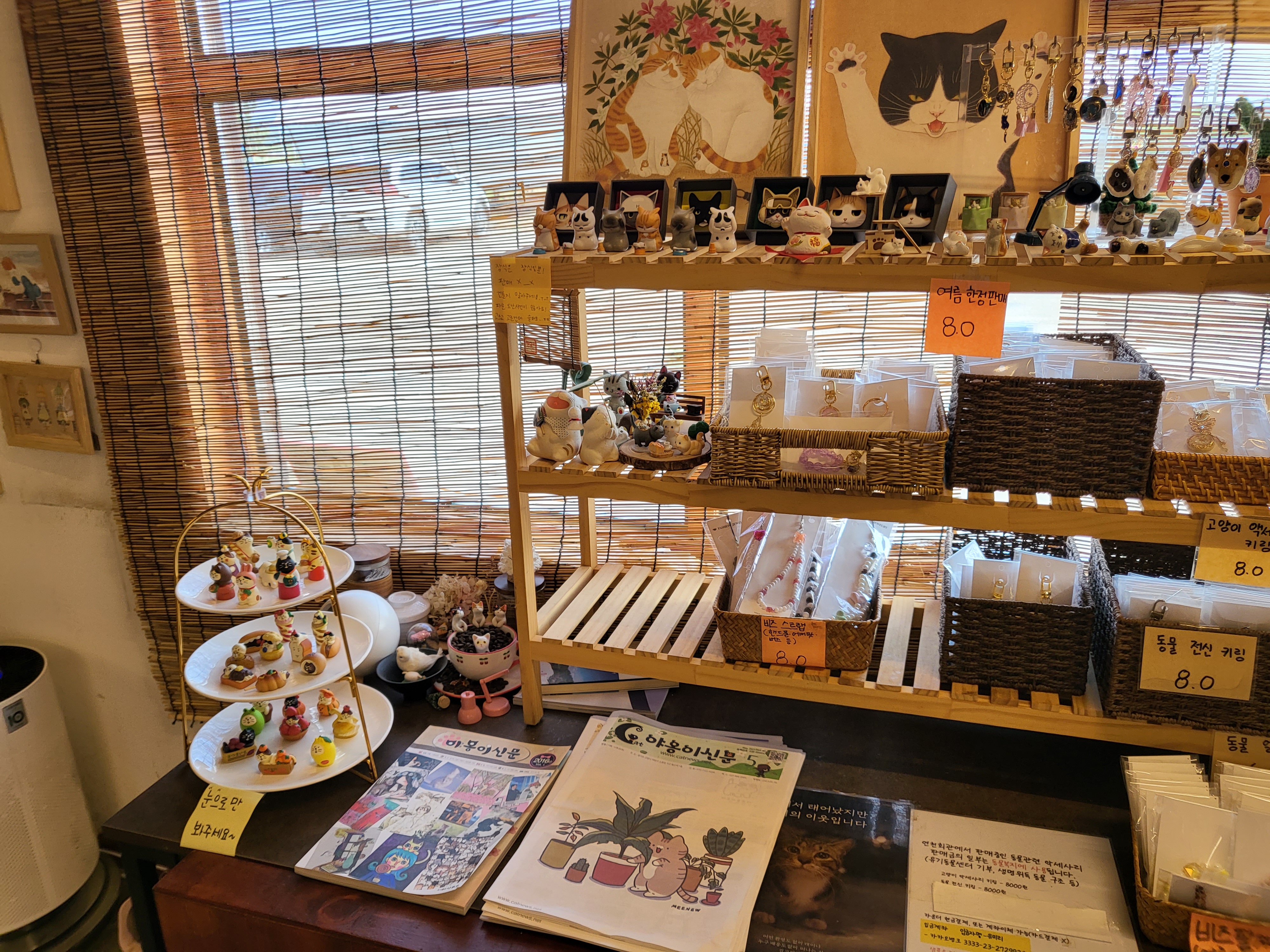고양이 캐릭터의 다양한 소품들도 볼 수 있어요. 직접 판매도 하는 상품들이에요