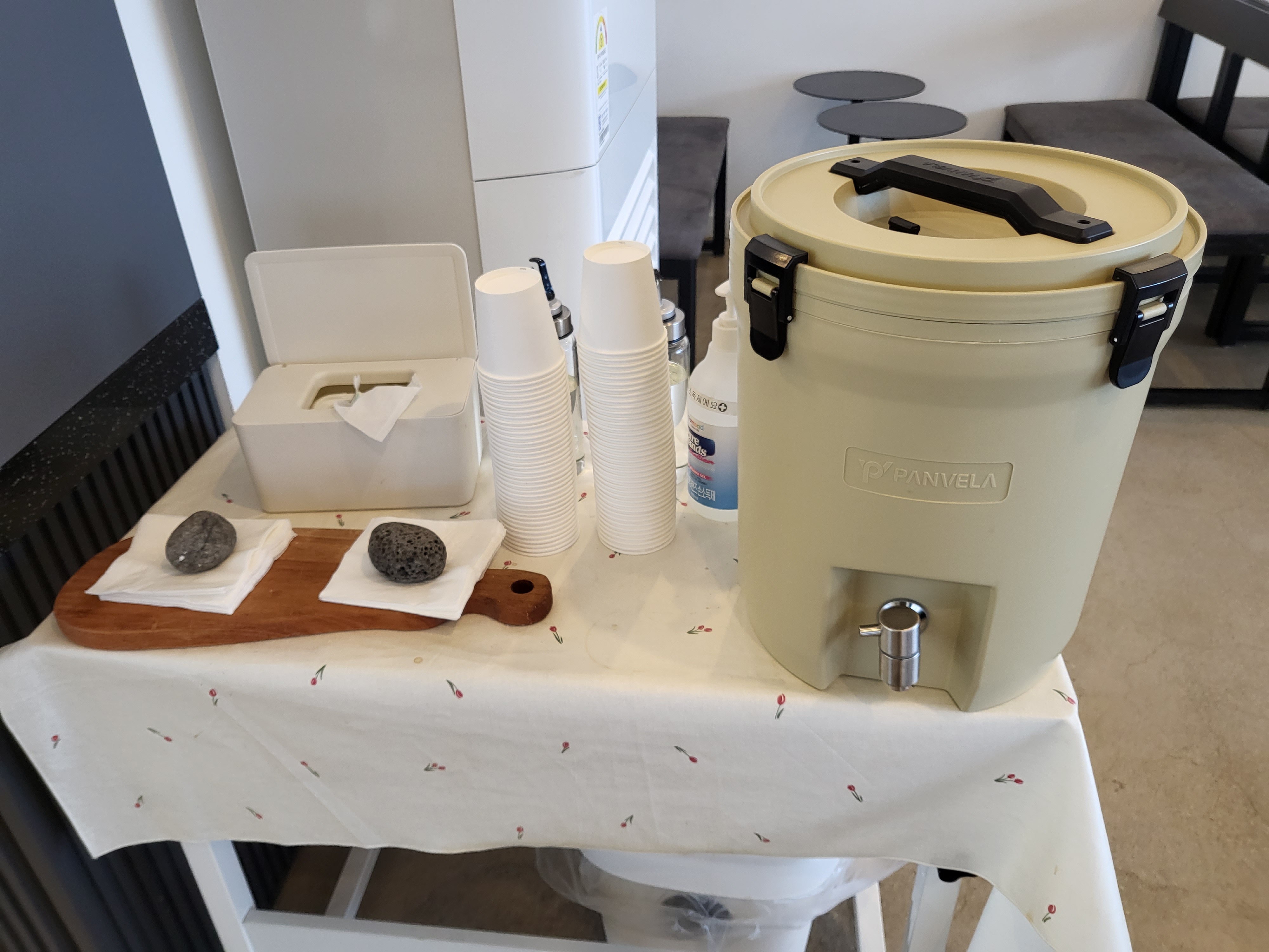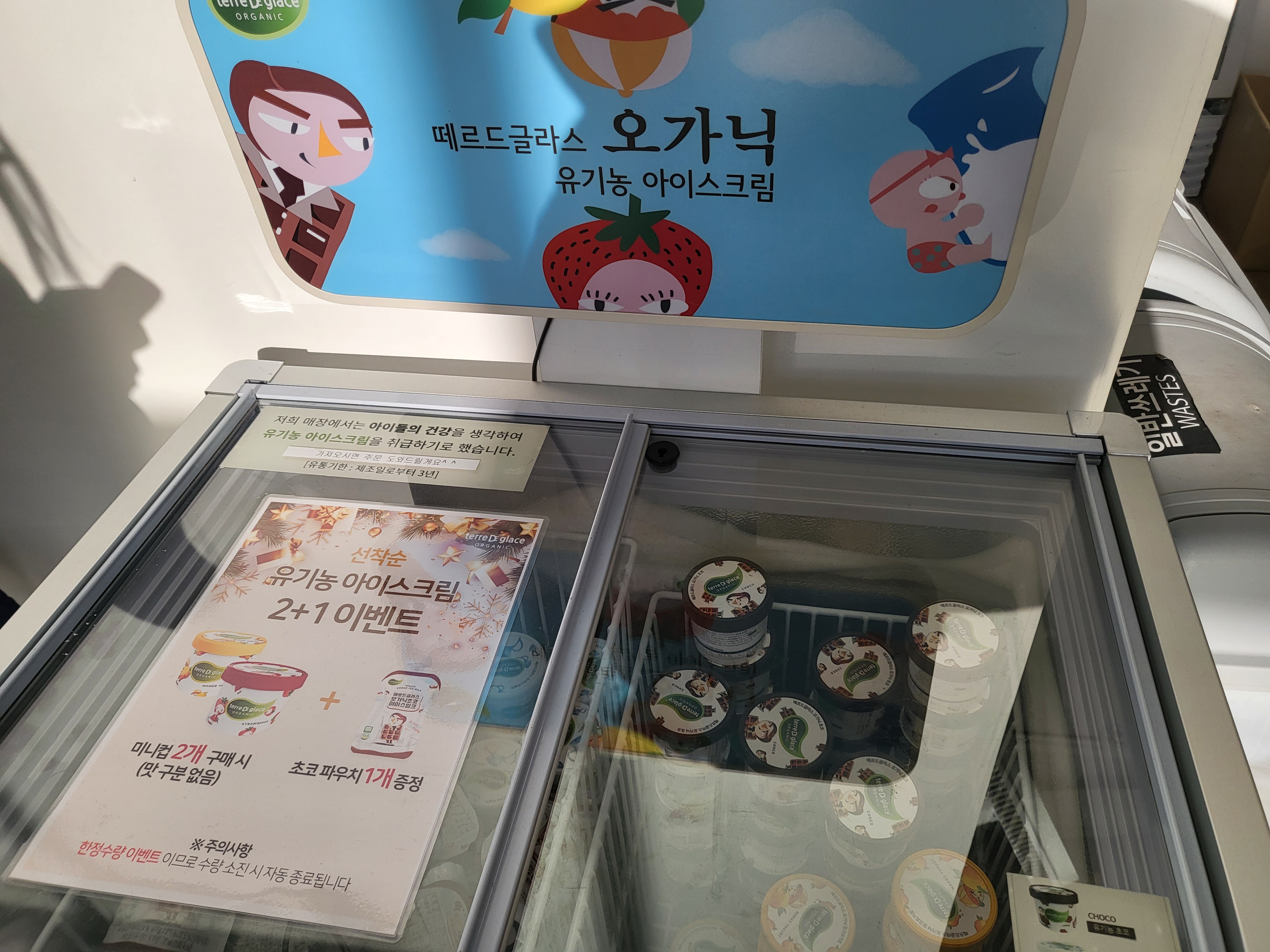 한쪽에는 물, 티슈, 물티슈가 구비되어 있고 유기농 오가닉 아이스크림도 판매하고 있어요.