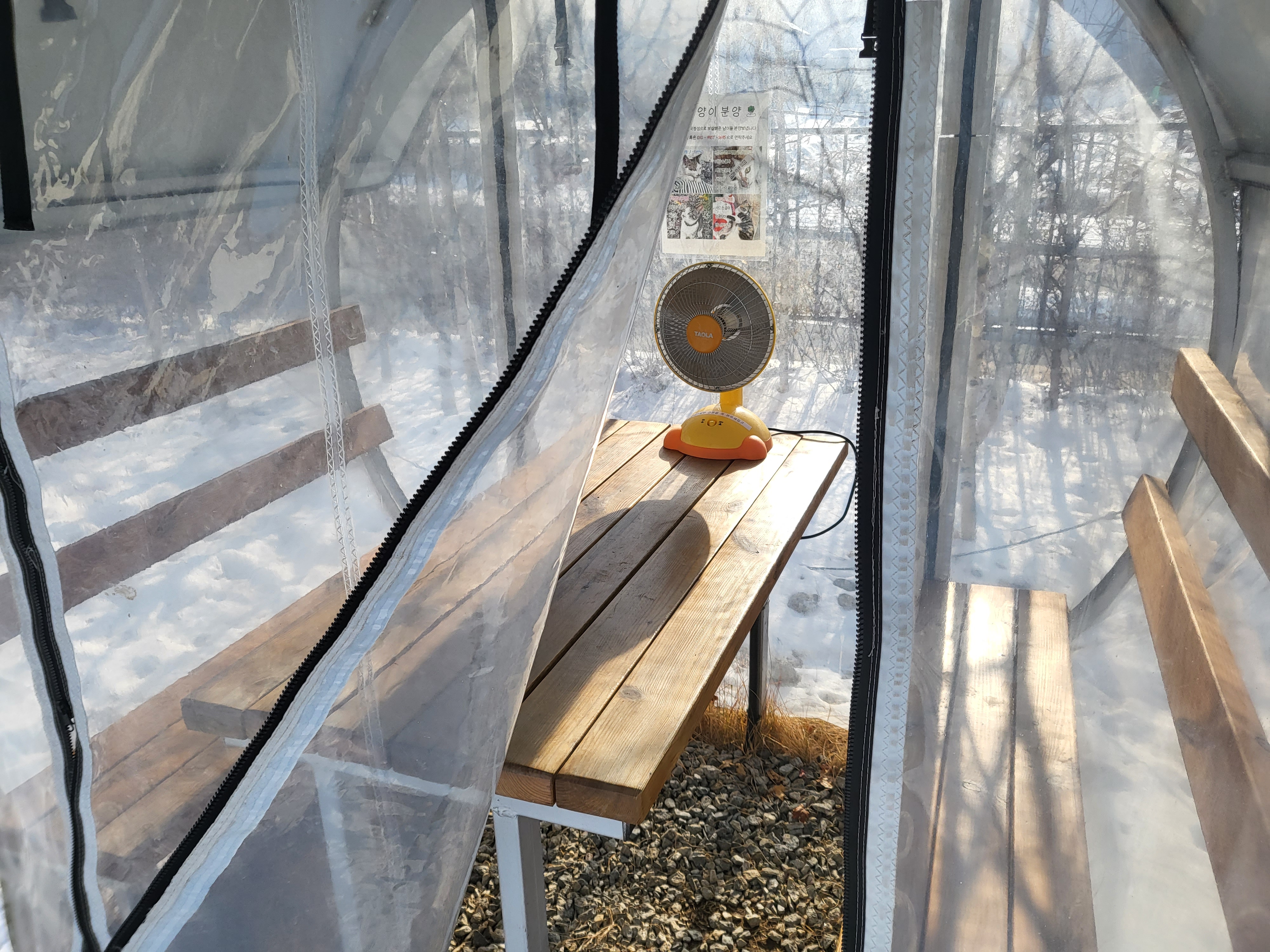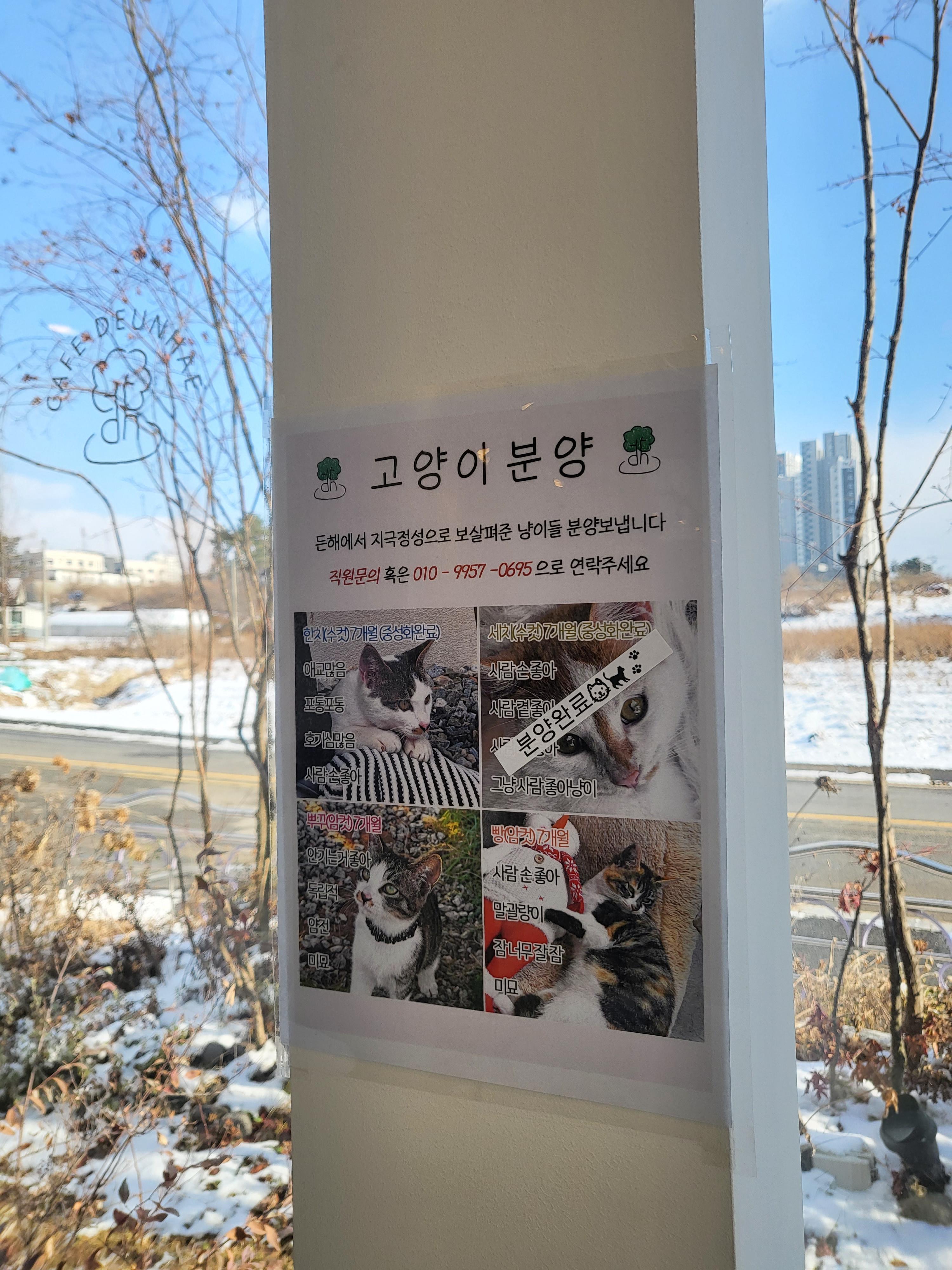 벽에는 고양이를 분양한다는 벽보가 붙어 있어요. 총 4마리 중 한 마리는 분양이 완료됐다고 해요.