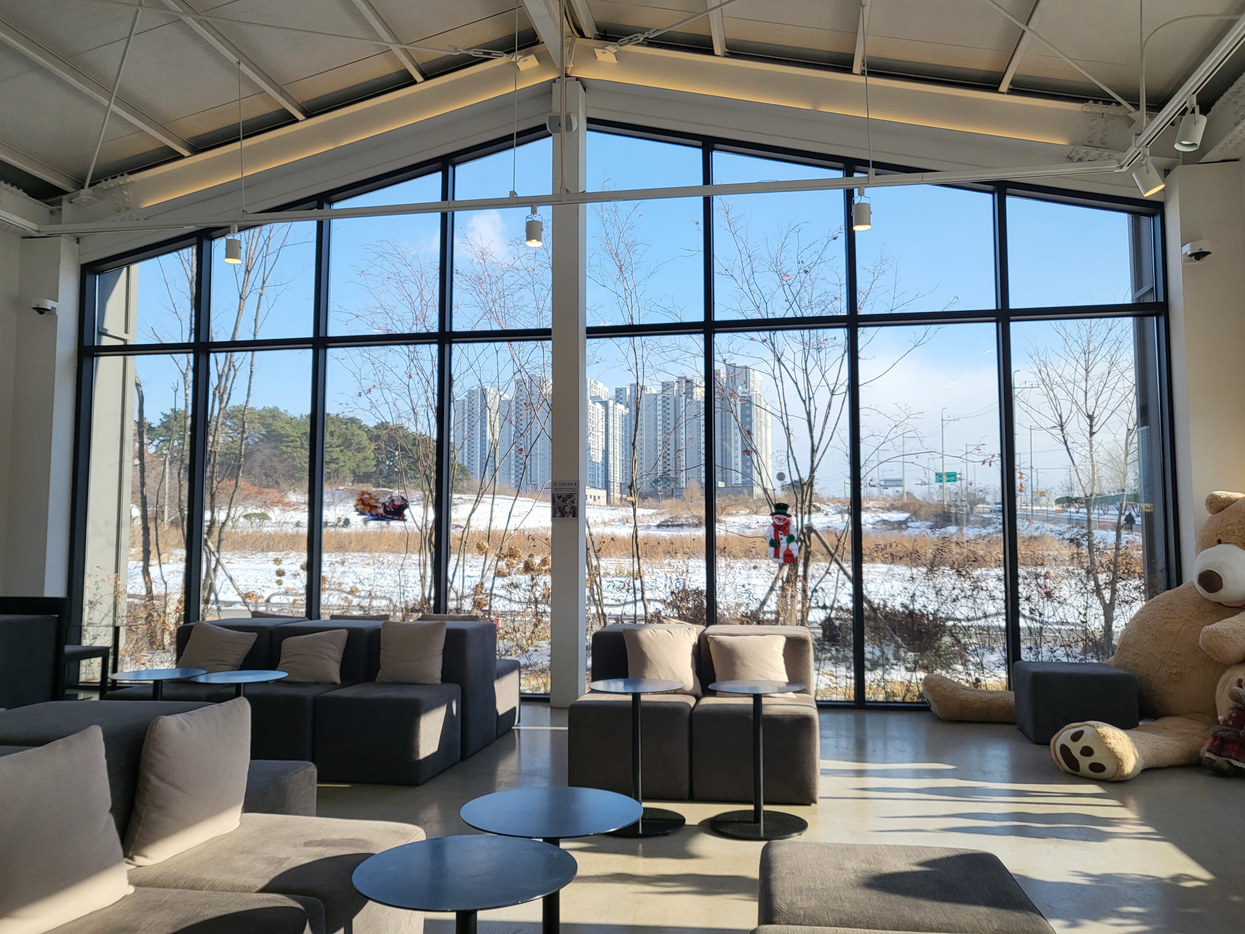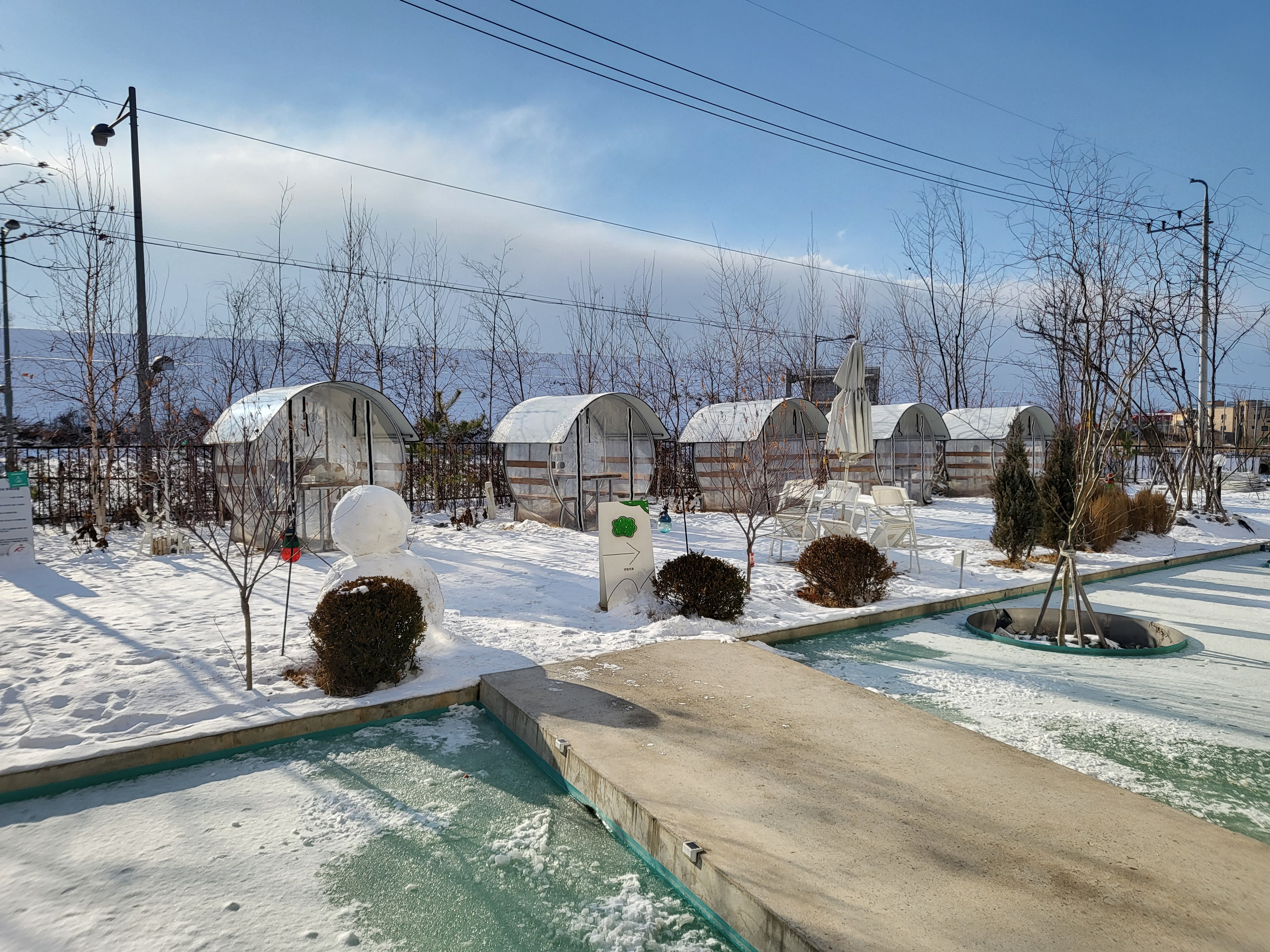 야외에는 수영장 대신에 흰눈이 소복이 쌓인 정원과 눈사람이 겨울의 또 다른 매력을 느끼게 하네요.