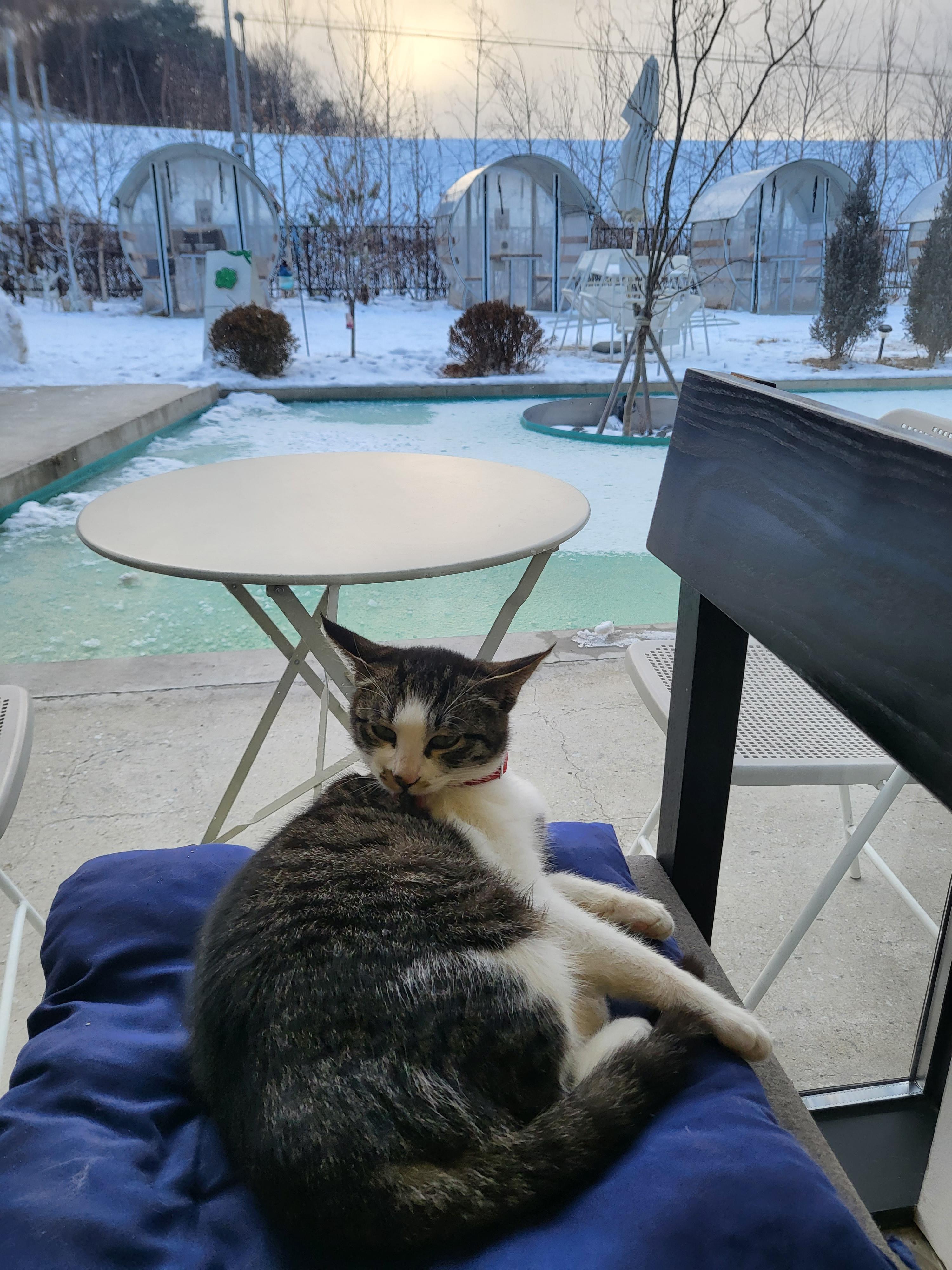 귀여운 고양이 한 마리가 카페 안으로 들어와 햇살 좋은 자리를 차지하고 있네요.