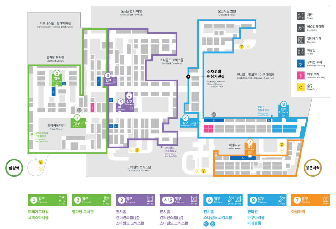지하철로 삼성역, 봉은사역이 바로 이어져 있어서 교통도 매우 편리하고 넓은 주차시설을 보유하고 있지만 자가용을 이용하는 분들께는 매우 높은 주차요금을 요구합니다.