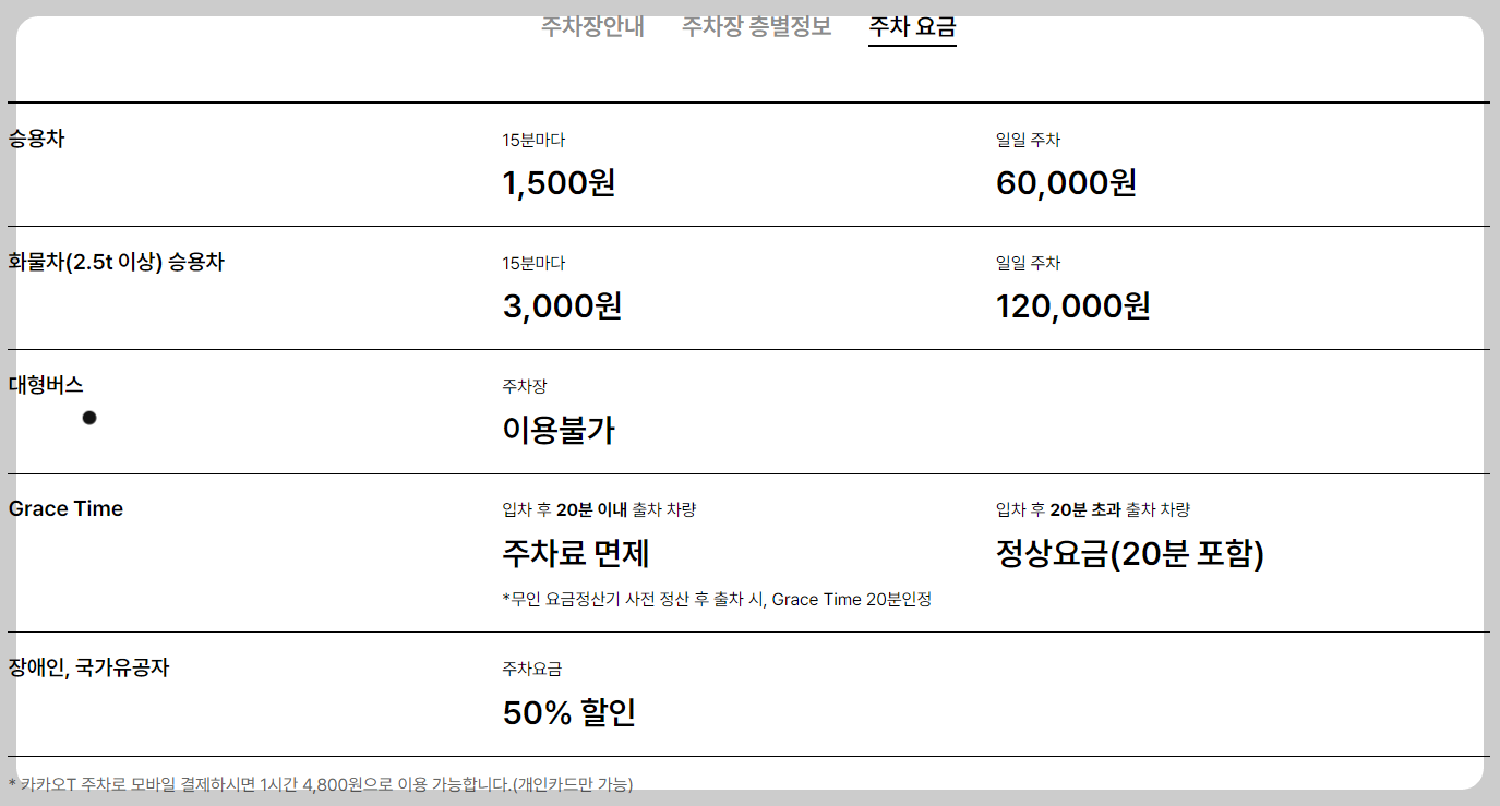 카카오T주차로 등록하고 모바일로 자동결제하면 1시간에 4,800원으로 가격 할인을 받고 주차요금 정산기에서 정산 절차 없이 편하게 이용할 수 있습니다.
