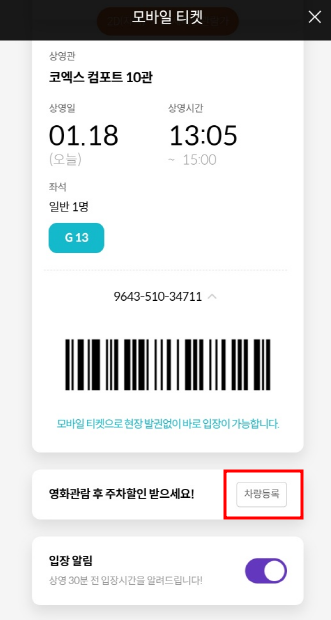 위와 같은 방법이 아니라 영화표를 모바일로 구매한 경우에는 메가박스 모바일 어플에서 예매내역> 차량등록을 하시면 됩니다.