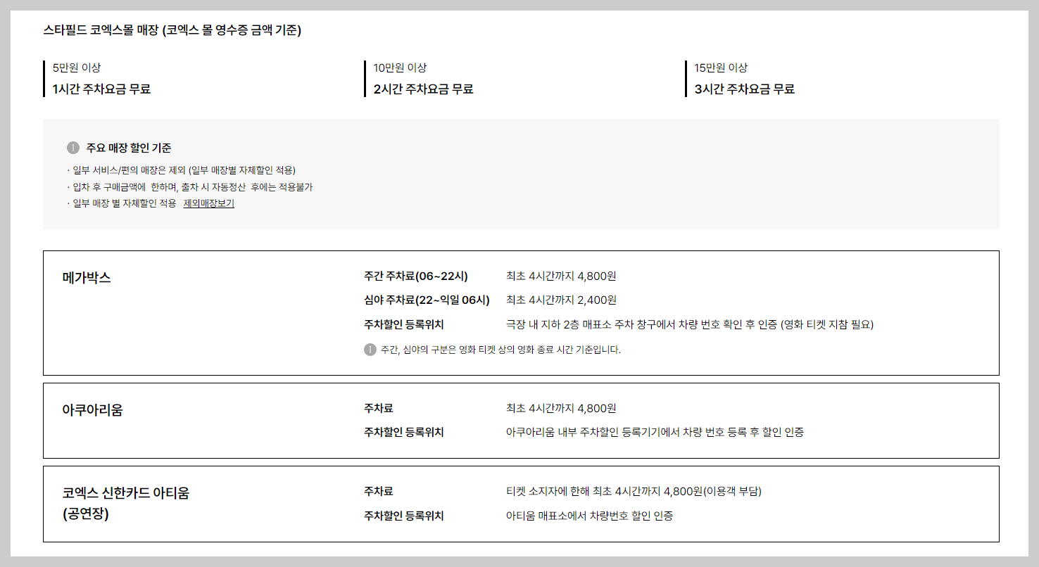 또한 아쿠아리움, 아티움 공연장 이용 시 4,800원으로 할인 혜택, 그리고 메가박스 영화관 이용은 4시간까지 4,800원, 심야 시간대에는 4시간에 2,400원으로 확실히 주차요금을 아낄 수 있어요.