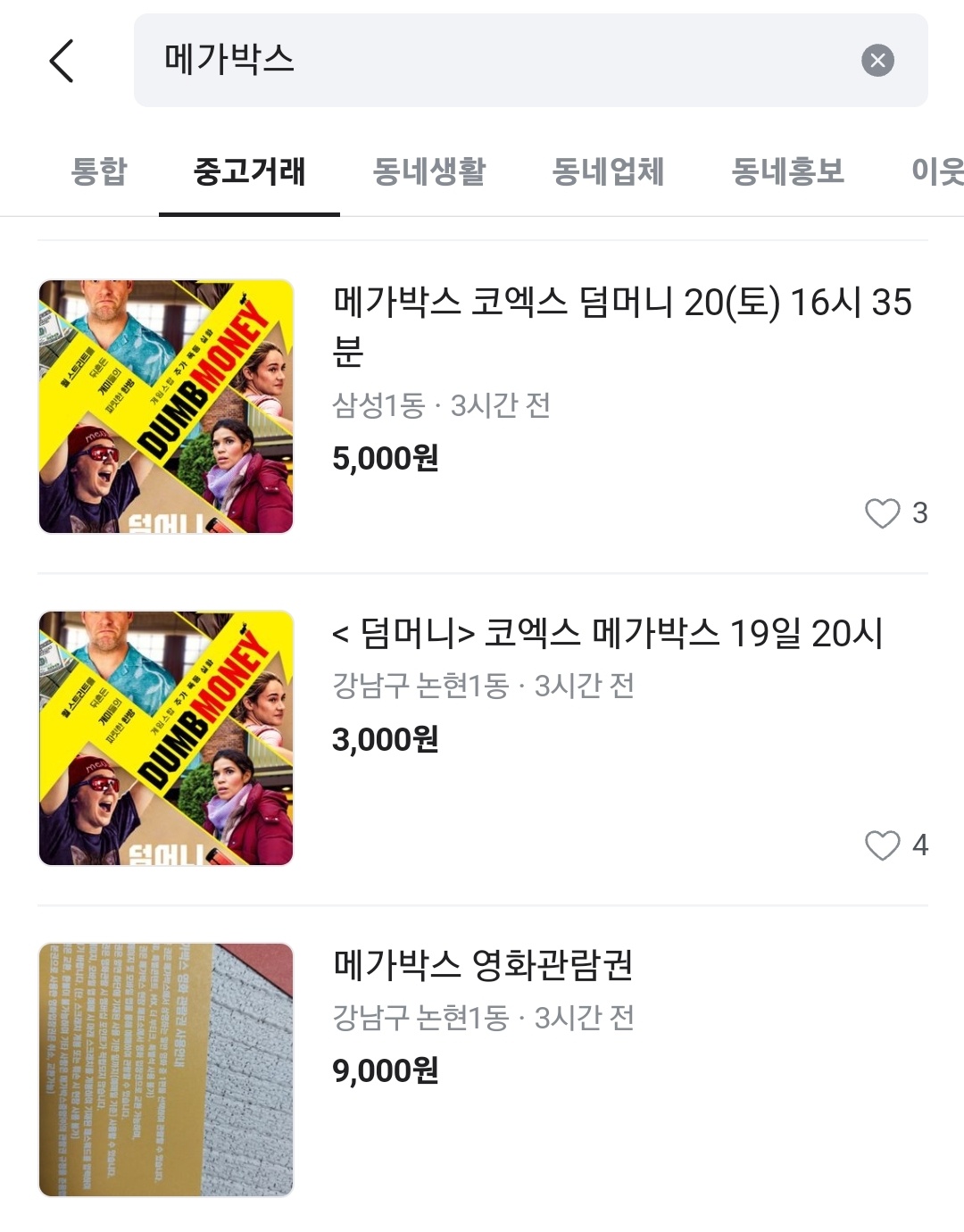 실제로 당근마켓을 통해 영화표가 7,000원~9,000원에 거래되고 있고 특히 이미 예매된 표는 3,000원~5,000원 더욱 저렴하게 구매도 가능하네요. 구매해서 영화가 끝나는 시간에 맞춰 주차할인을 받으면 됩니다!