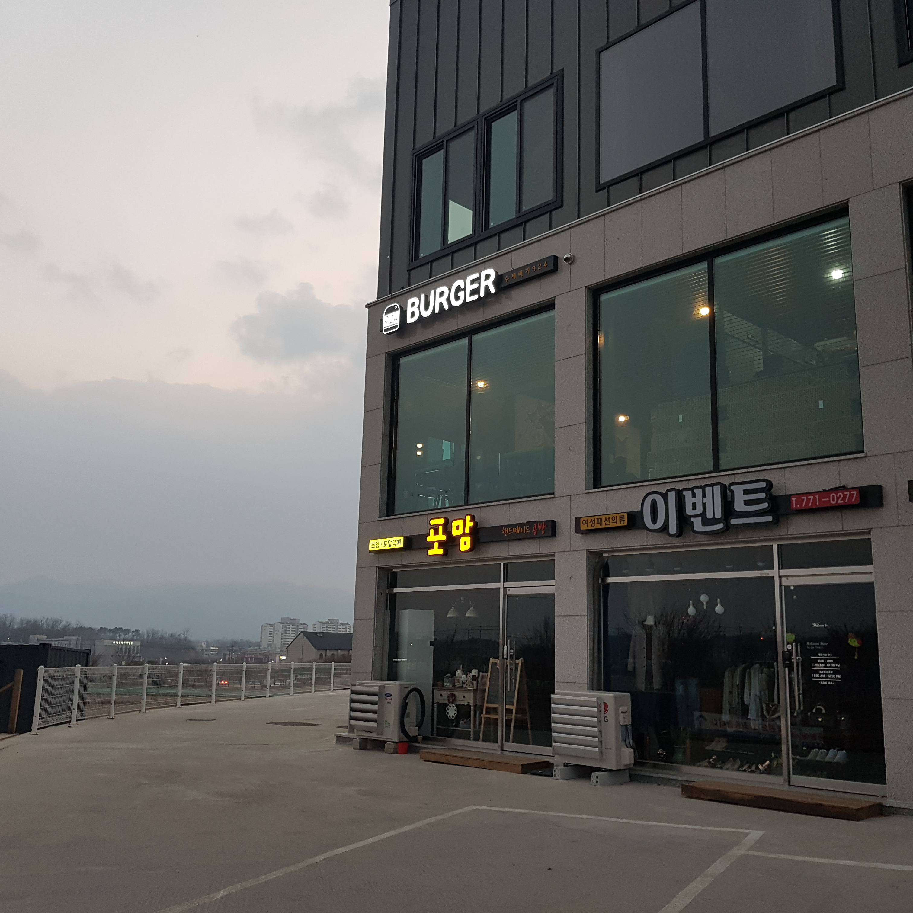 건물 상가에 햄버거집을 찾을 수 있었어요