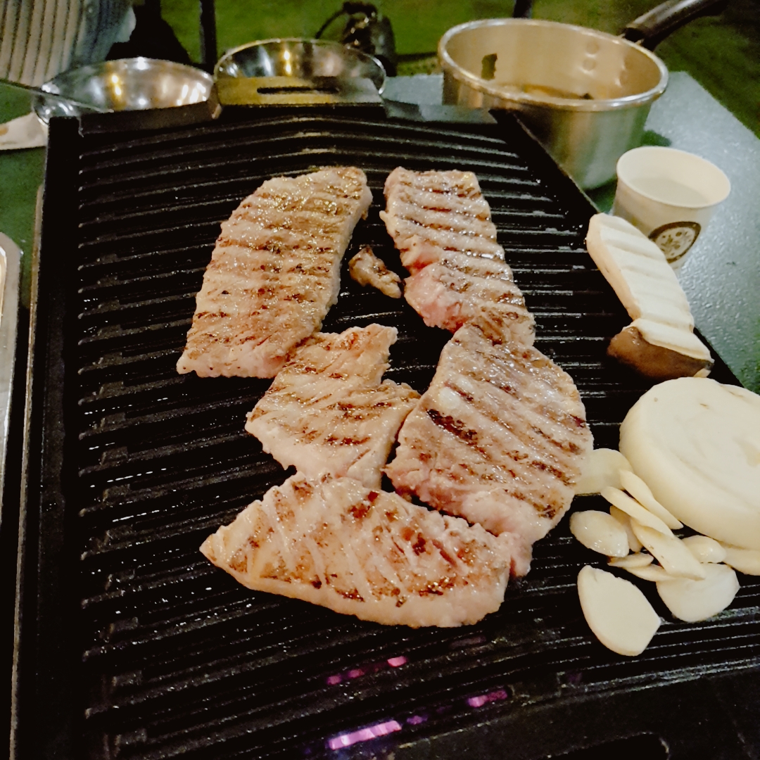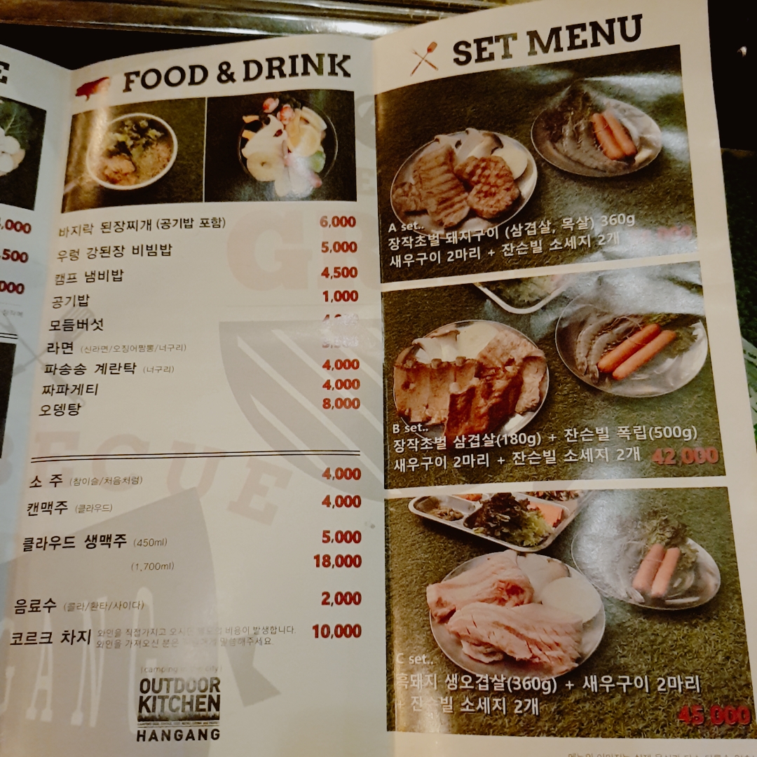 야외에서 고기를 구워 먹는 듯한 분위기를 주네요
