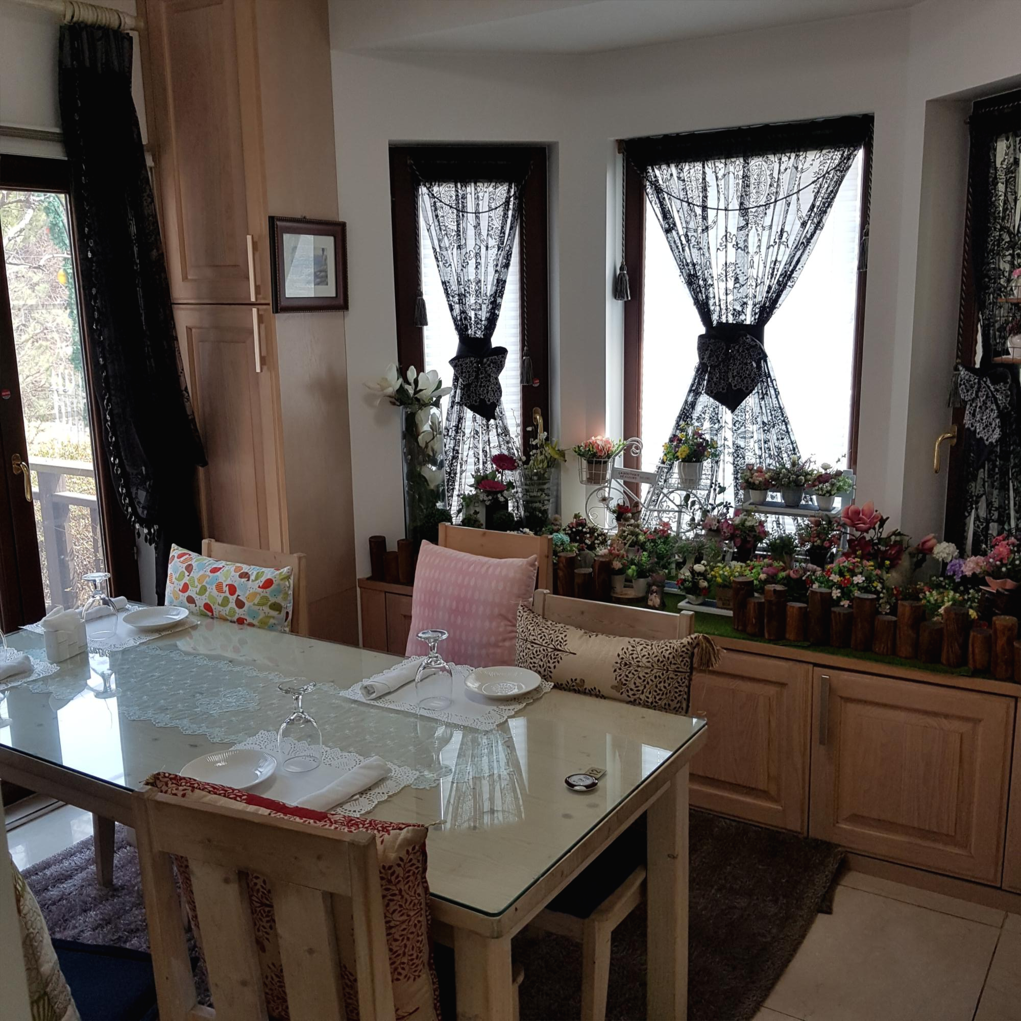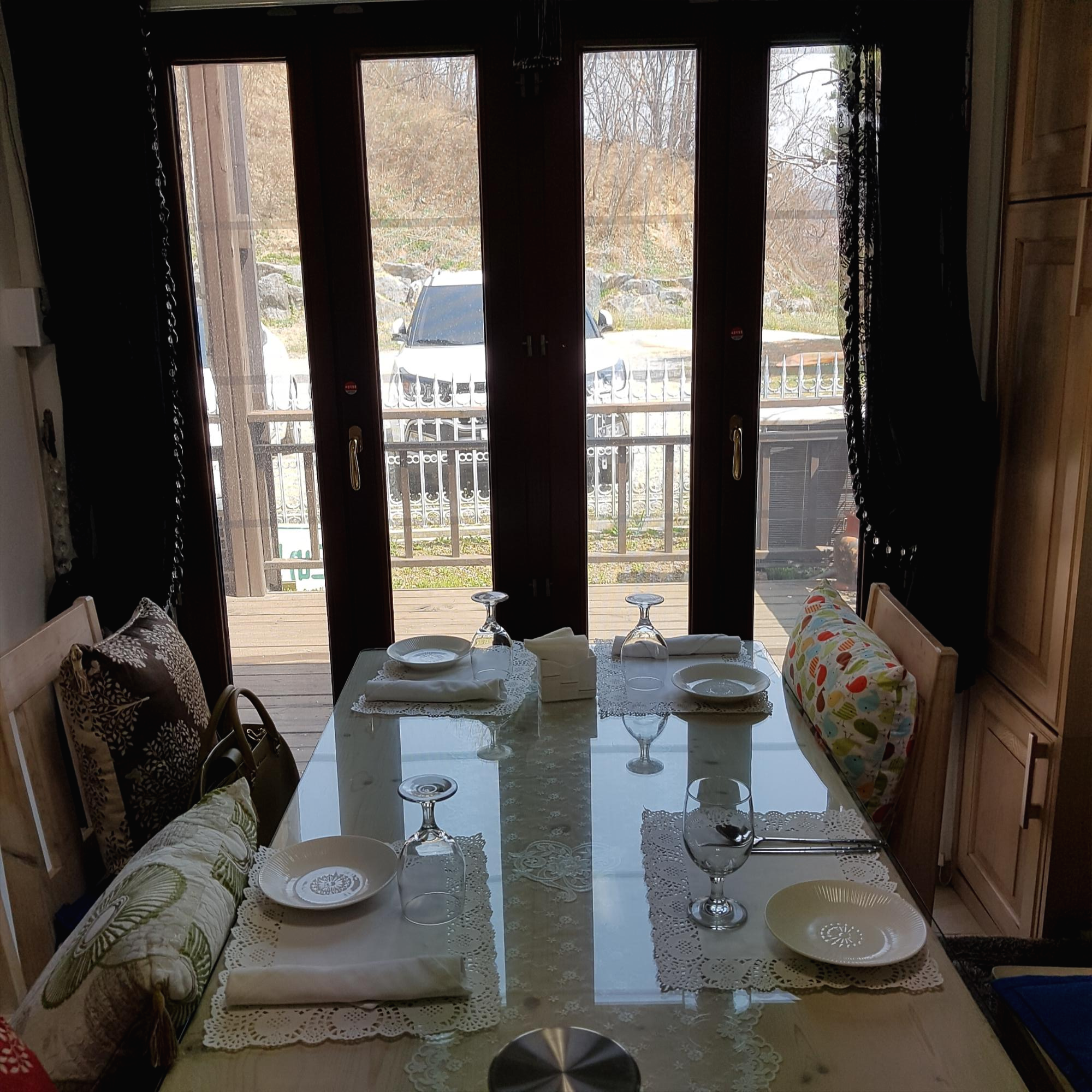 야외가 보이는 식탁에서 함께 식사할 수 있어요