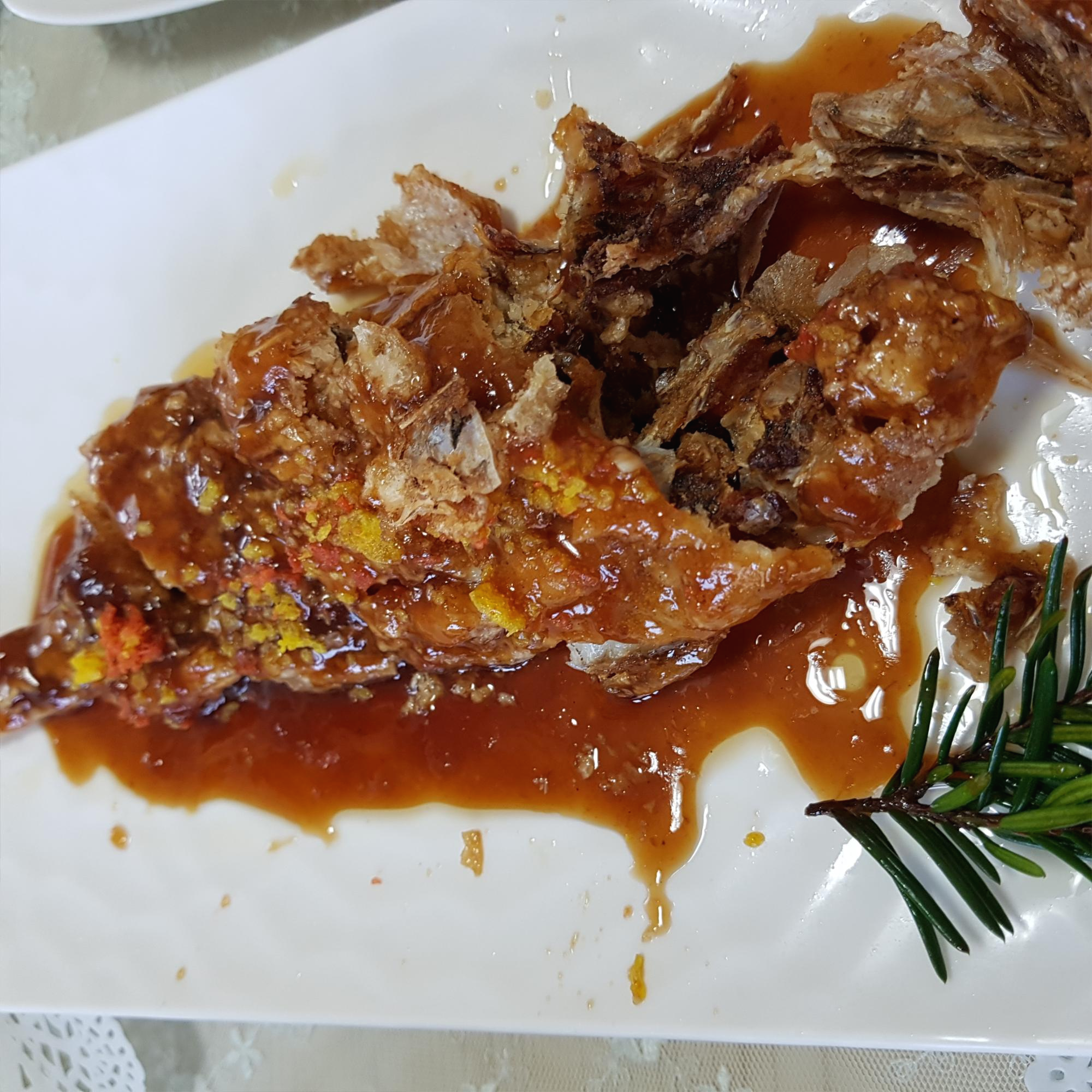 생선을 튀겨서 그 위에 닭강정소스 같은
