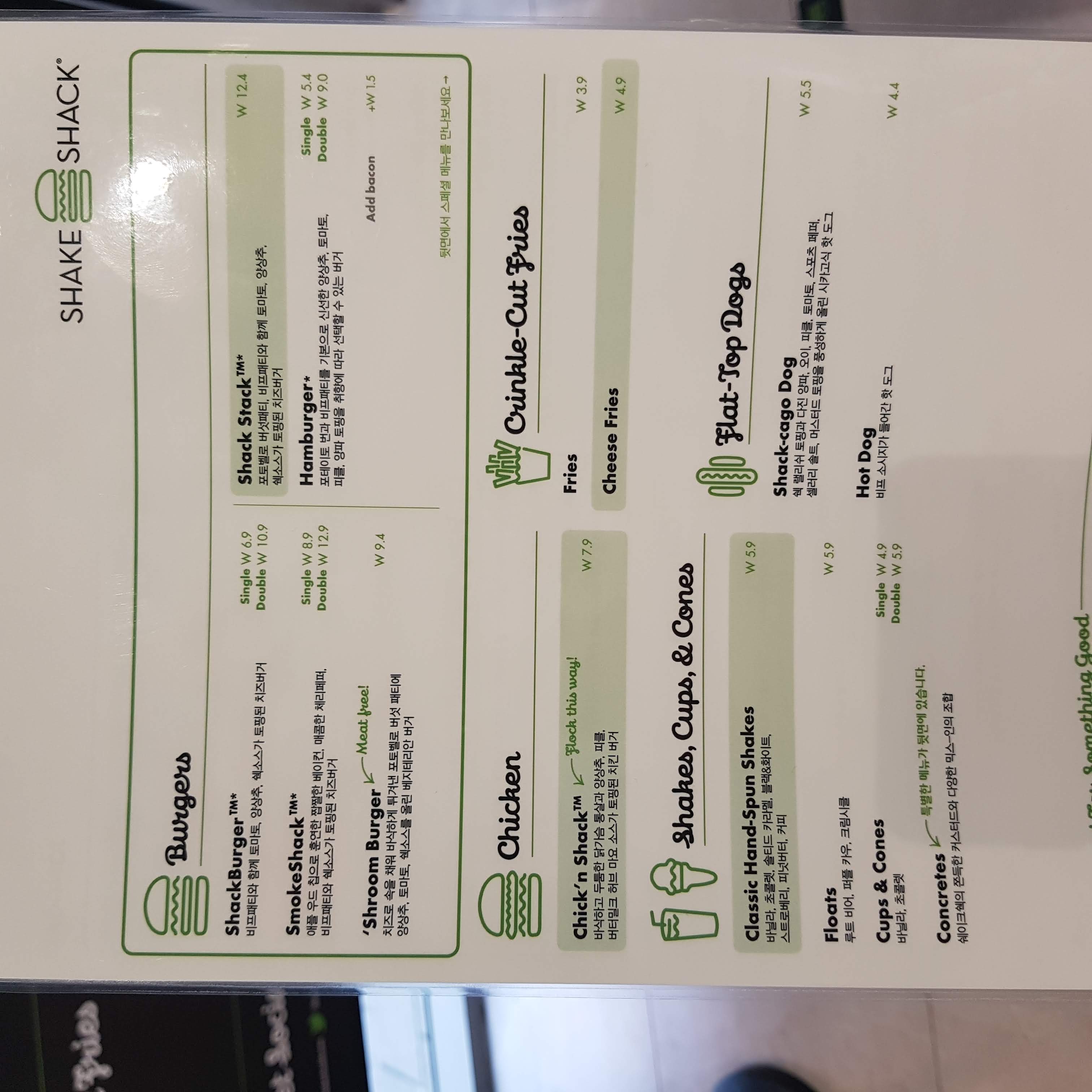 쉑쉑버거의 가격이 적힌 메뉴판이에요