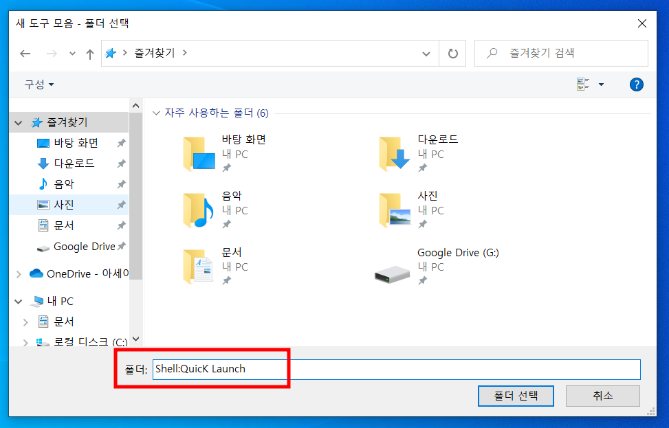 윈도우즈 빠른실행 작업표시줄을 만들고
